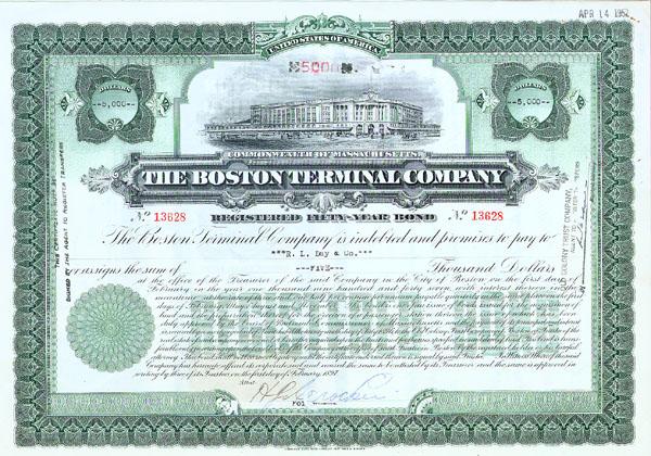 1897, Massachusetts. Black/Green. $5000 bond bearing 3 1/2% interest. Vignette of building at top center. Punch cancelled. Very fine.