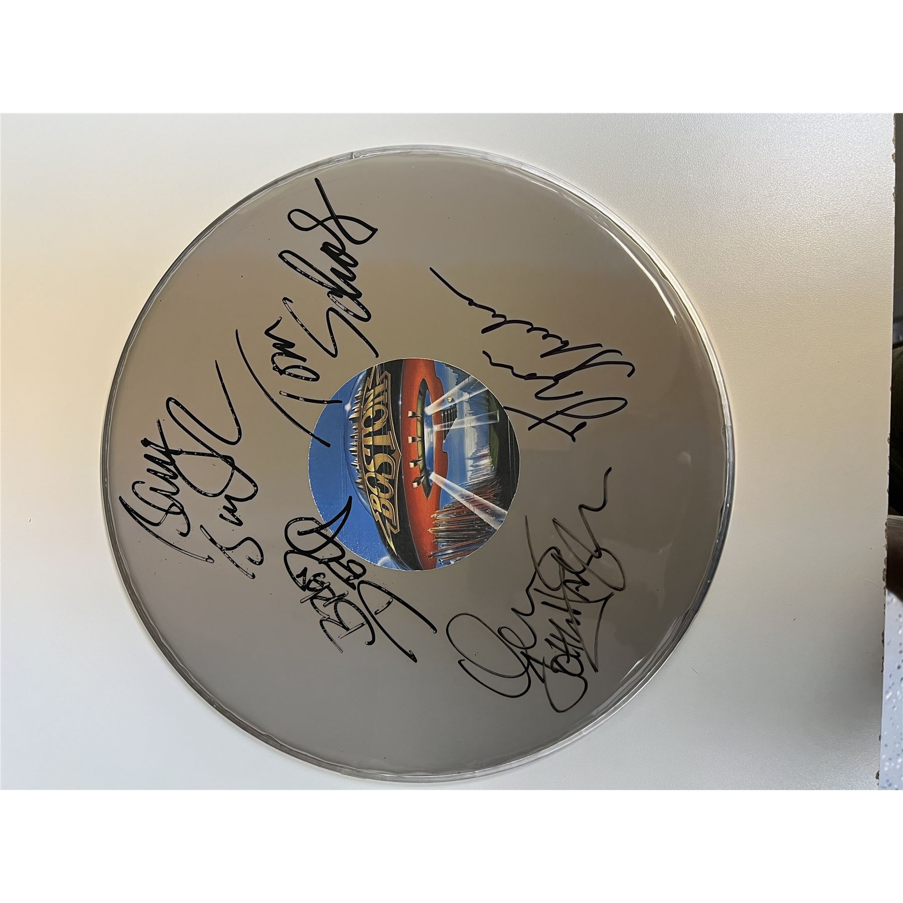 Boston band signed drum head autographed by Tom Scholz, Brad Delp, Barry Goudreau, Fran Sheehan, and Sib Hashian
