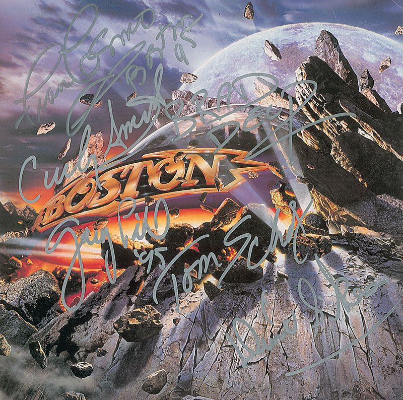 Boston album flat signed on the front in silver ink by Brad Delp, Tom Scholz, Gary Pihl, David Sikes, Curly Smith, and Fran Cosmo. In fine condition, with a few creases. The record is not included.