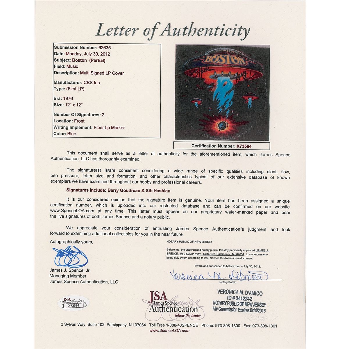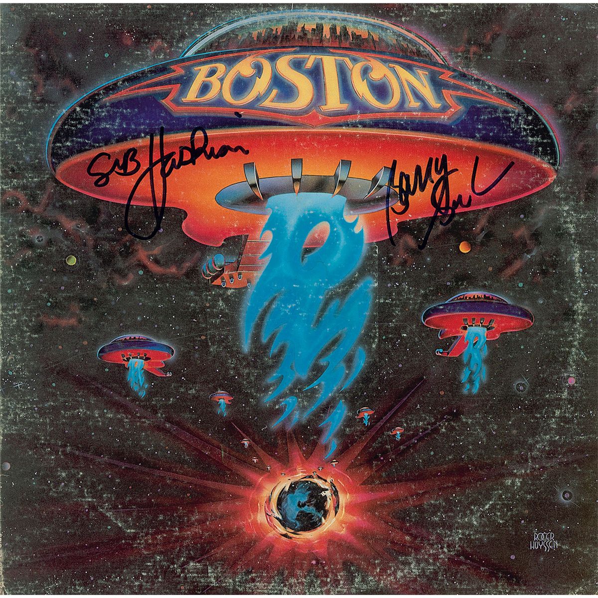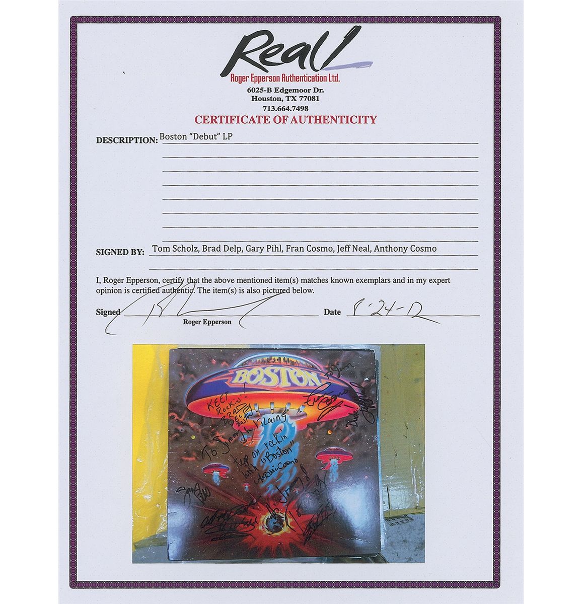 Self-titled debut album signed on the front cover in black felt tip by Brad Delp, adding “Keep rockin’!” and the band’s name, Tom Scholz (ins) also adding the band’s name, Gary Pihl, Fran Cosmo (ins), Jeff Neal, and Anthony Cosmo. In fine condition, with a couple of creases near bottom edge. The record is not included. Album is accompanied by a full letter of authenticity from Roger Epperson/REAL. Also included is a second debut album, signed on the front cover in felt tip by Barry Goudreau and Sib Hashian. The record is not included and is accompanied by a letter of authenticity from James Spence.