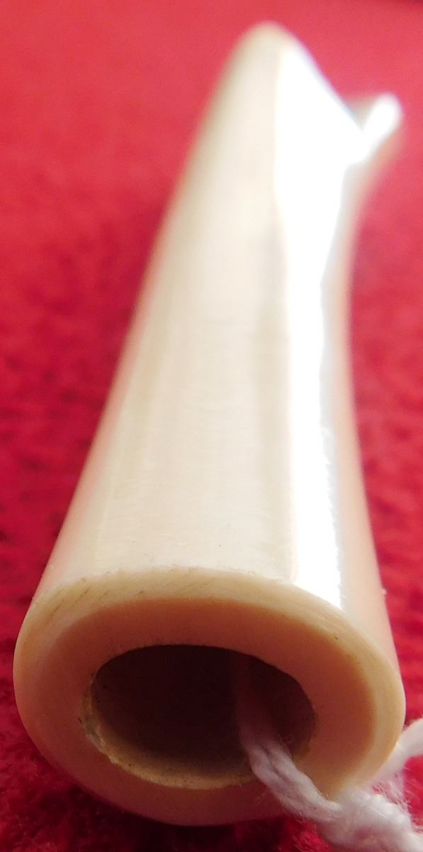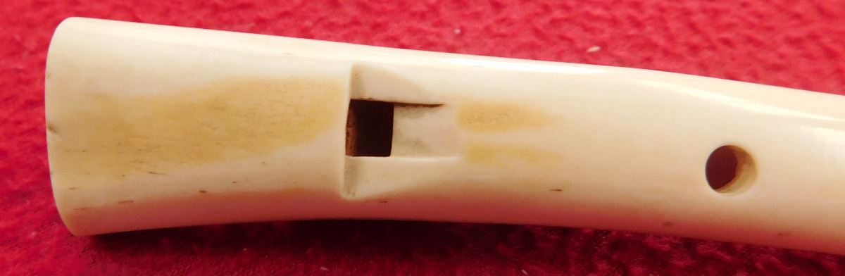 Bosun Mate's Whistle, circa 1890s. Made of teakwood and bone, the item measures 4.5" x 0.75" x 0.75". Alaska. Beautiful sound from this whistle, has several notes. Quite loud! Condition: Very nice, see images. Shipping: $16.50 w/insurance and signature.