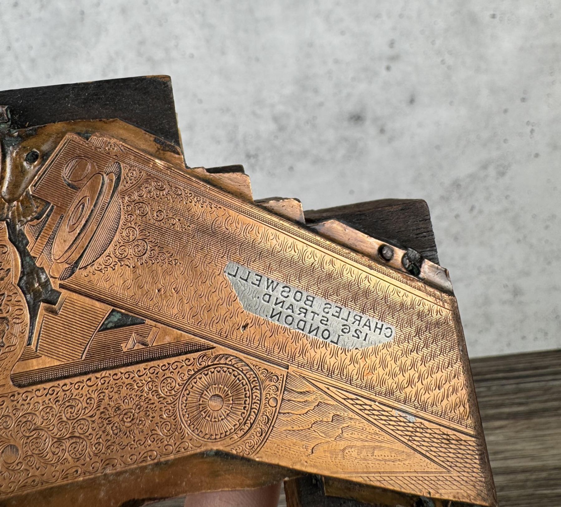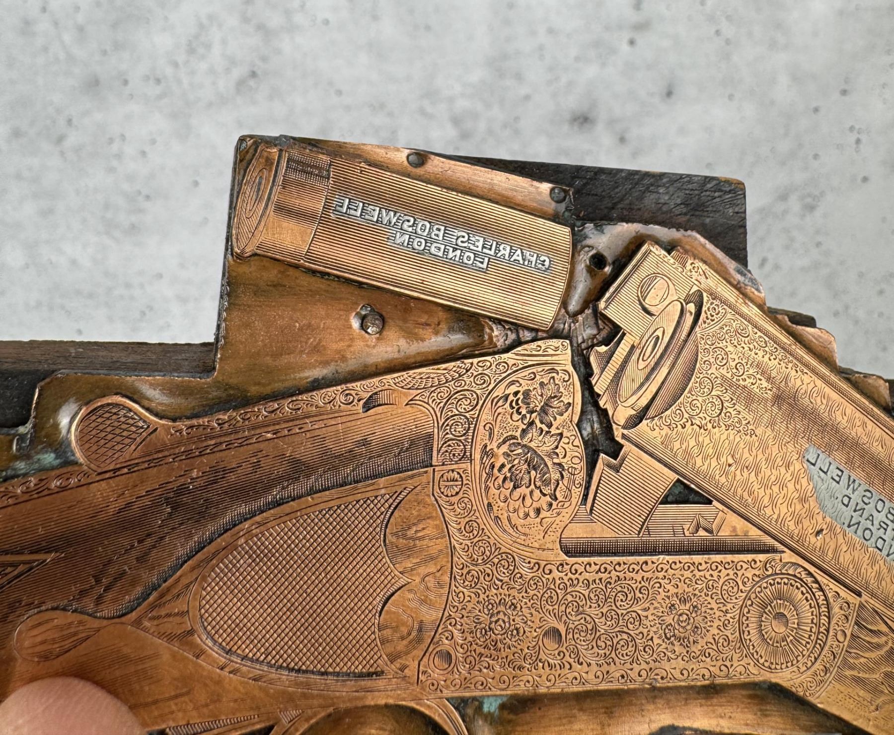 Copper gun catalogue printing plate for Charles Boswell shotguns with London address. 7 1/8" long by 3 3/8" tall.