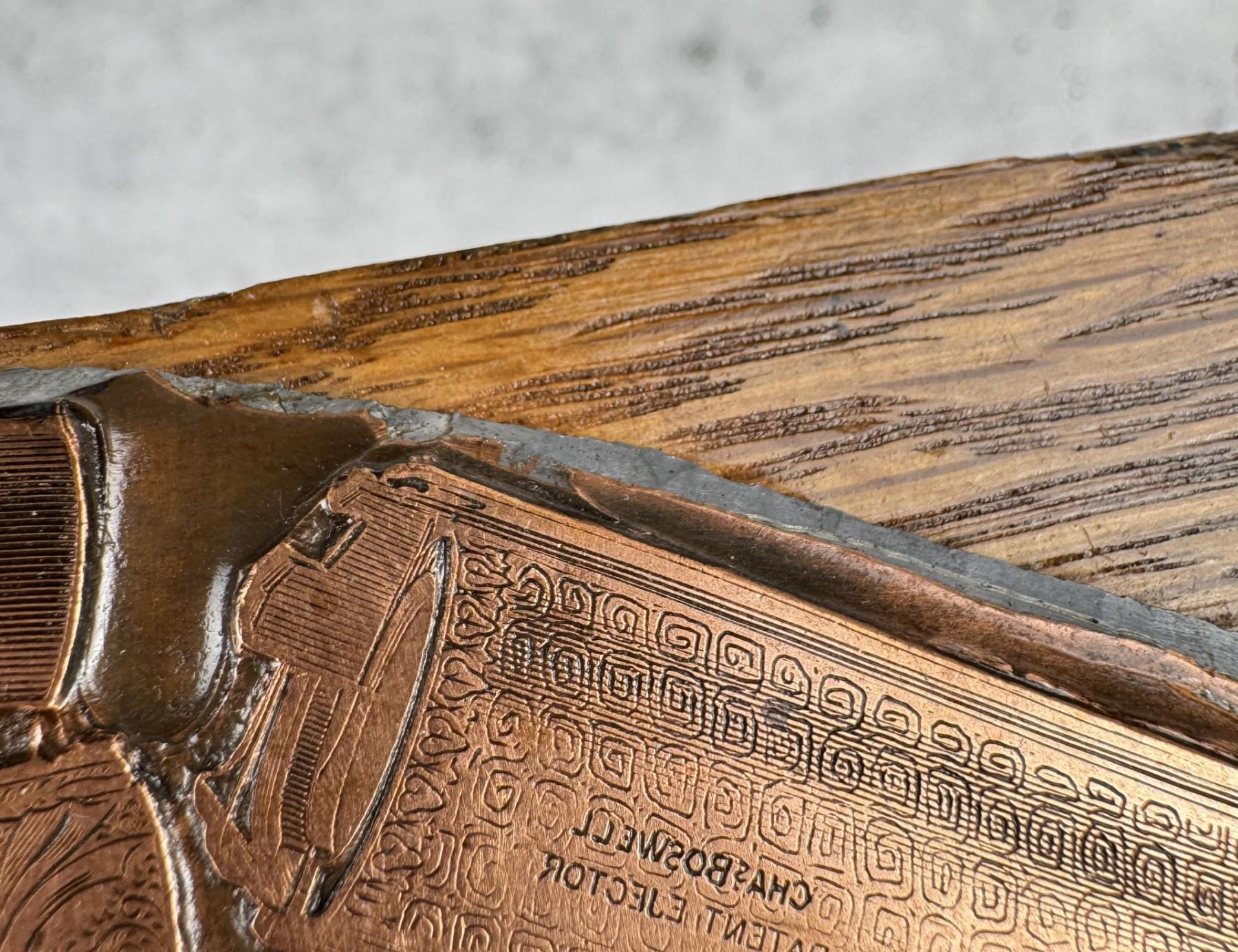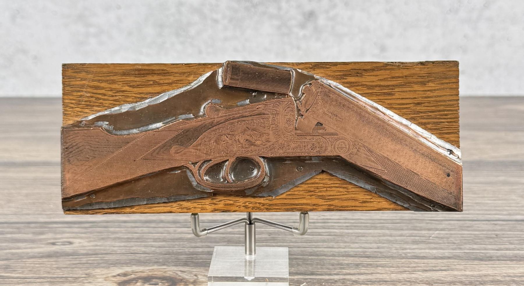 Copper gun catalogue printing plate for Charles Boswell shotguns. 4 5/8" long by 2 1/2" tall.7 5/8" long by 3" tall.