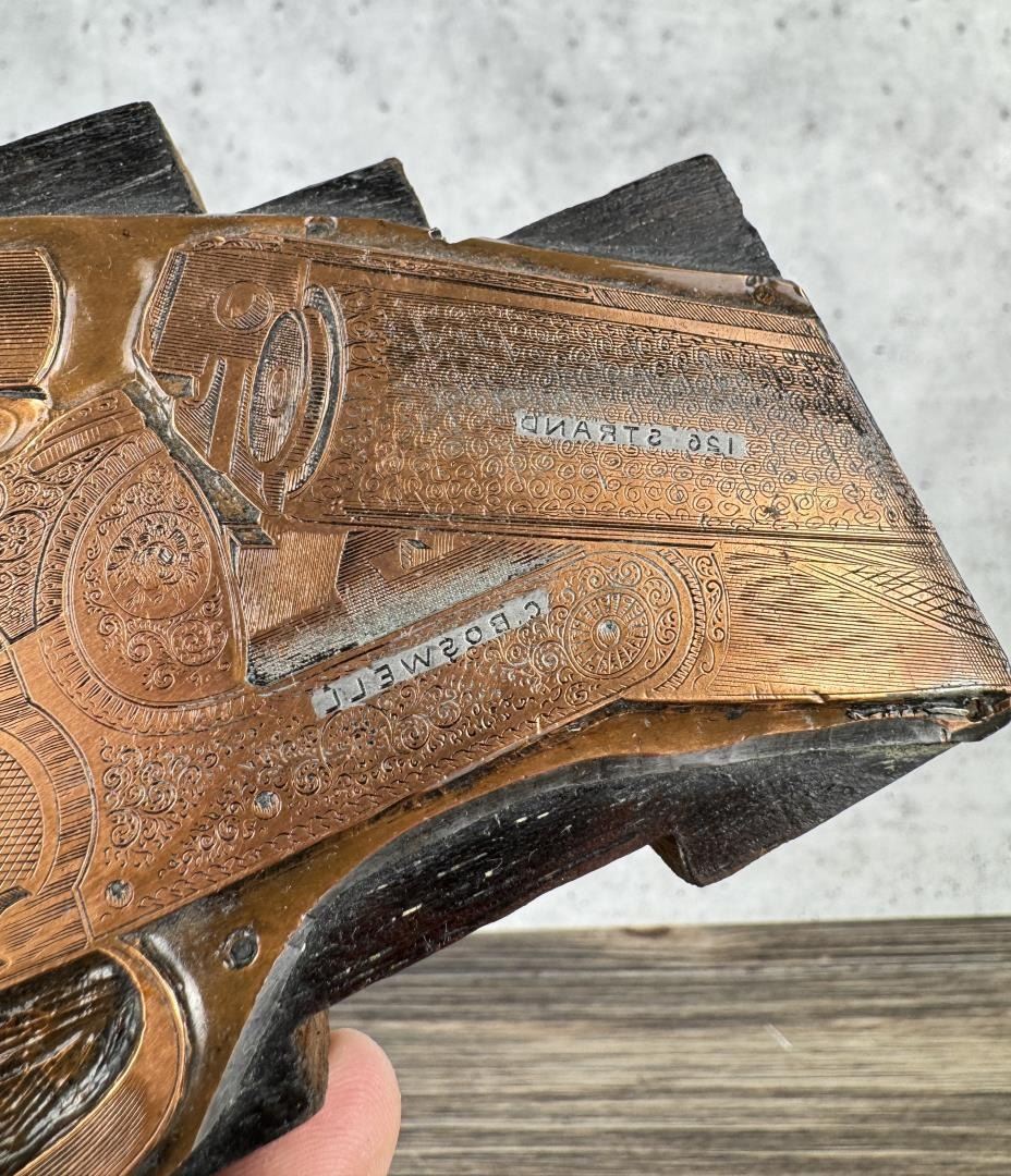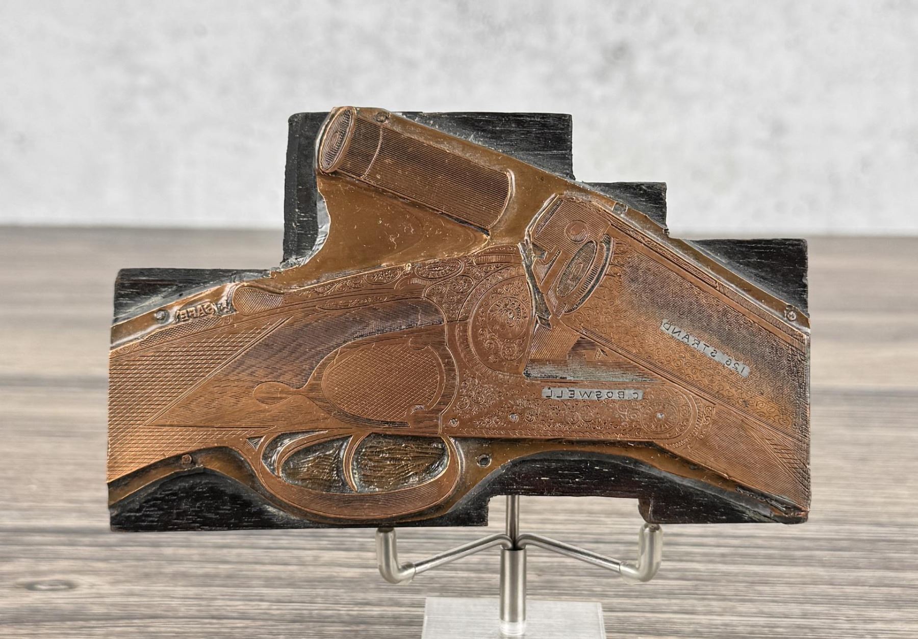 Copper gun catalogue printing plate for Charles Boswell shotgun. 5 3/8" long by 3 3/8" tall.