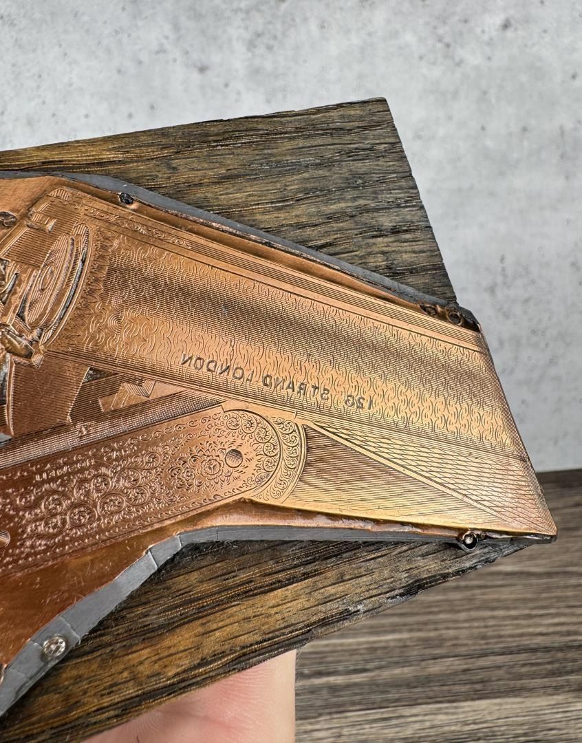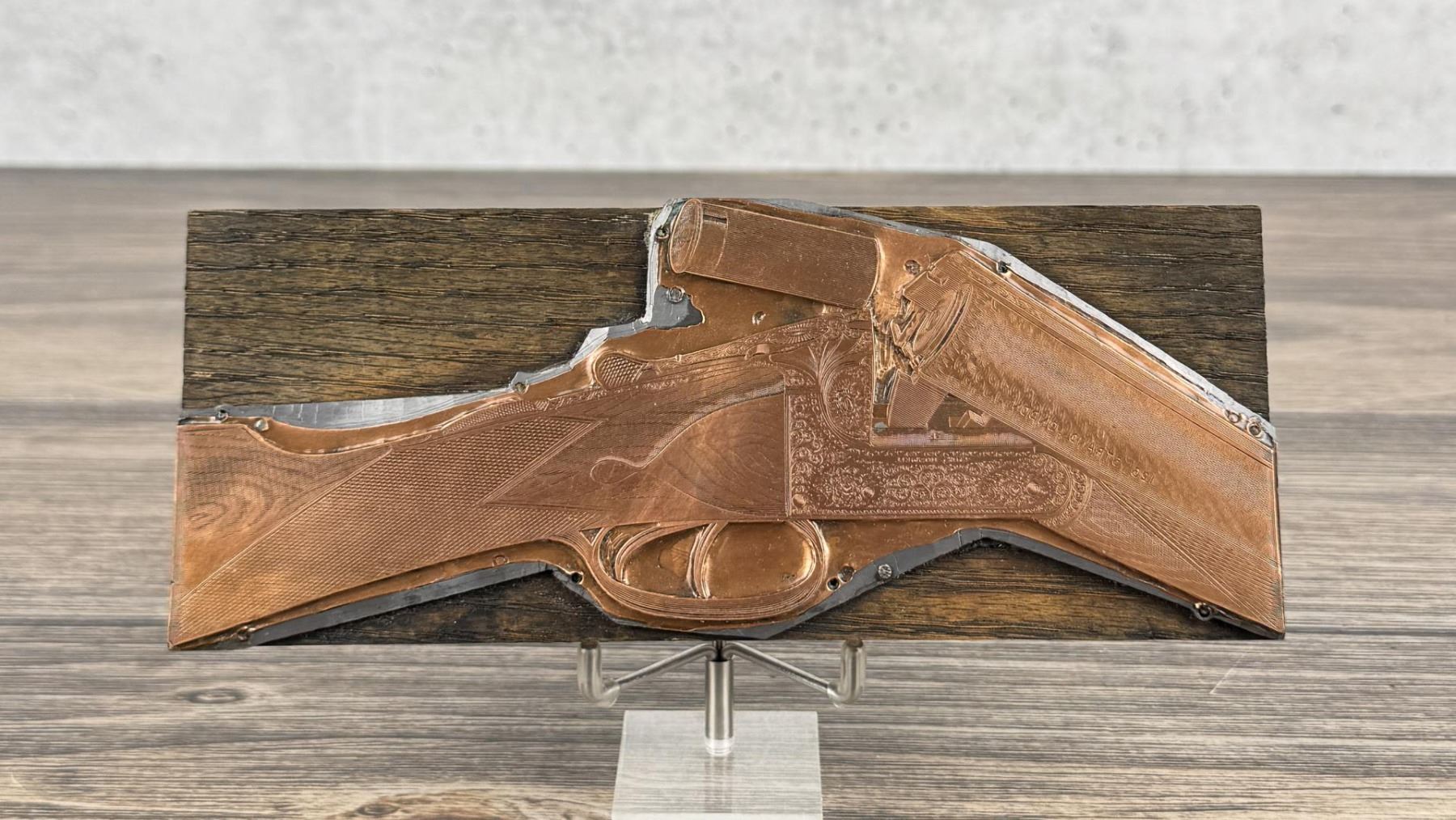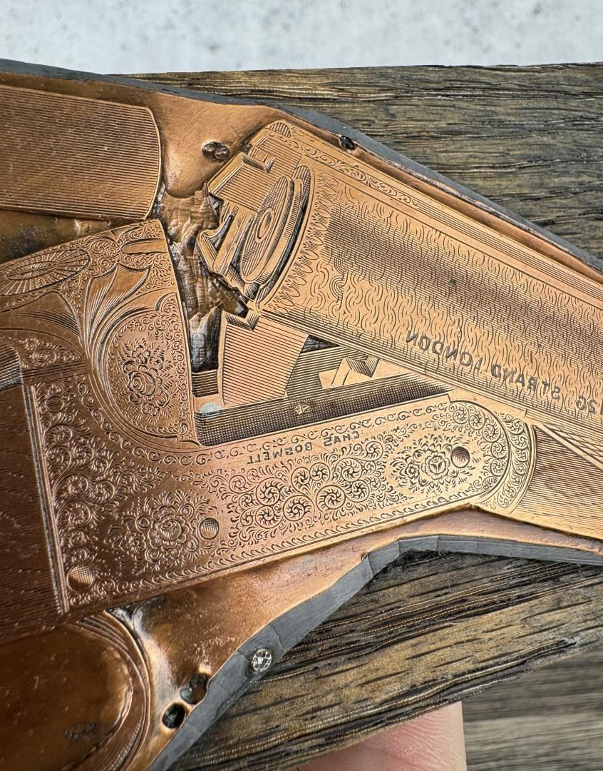 Copper gun catalogue printing plate for Charles Boswell non ejector shotgun. 8 1/8" long by 3 1/4" tall.