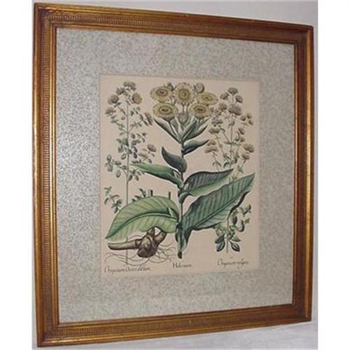 A large framed engraving titled "Helenium", framed in a large, 27" X 30" gold frame with a 4 " mat surrounding the colored botanical engraving. (11)