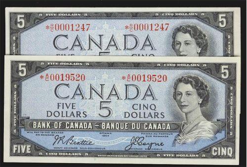 Both 1954 $5 "Replacement" Beattie-Coyne notes. Includes BC-39aA and 39aAi. Grades vary from AU-UNC to Uncirculated.