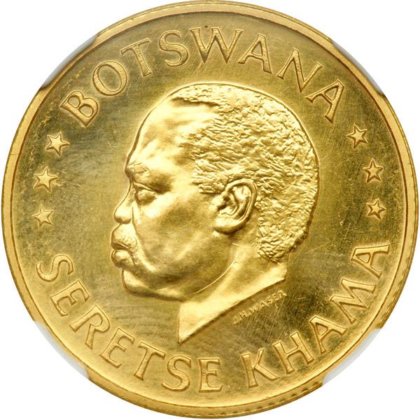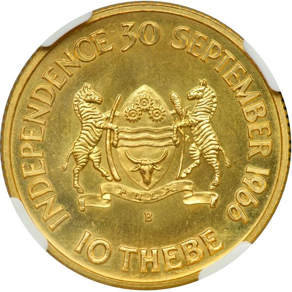 Botswana. 10 Thebe, 1966. Fr-1; KM-2. Weight 0.3267 ounce. Independence Commemorative. Bust of Sir Seretse Khama left. NGC graded MS-68.