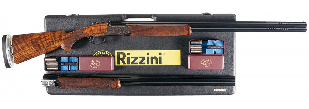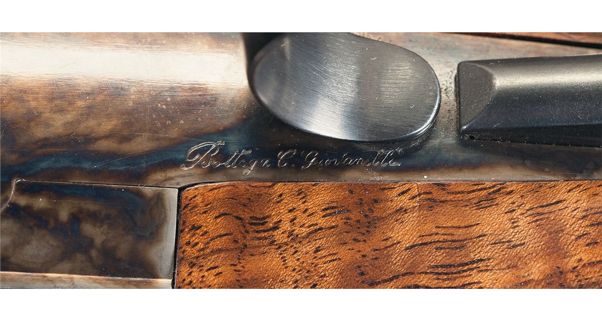 Manufactured circa 2001. The receiver has some small flourishes of oak leaf engraving and the break lever is decoratively pierced and engraved with "BR" engraved in script on both sides. Signed "Bottega C. Giovanelli" next to the trigger guard. The 20 gauge barrels are numbered to the receiver, have a single brass bead sight, are threaded for choke tubes with improved cylinder/modified installed, are ported, and have 3 inch chambers with long forcing cones and ejectors. Fitted with a beautifully figured, finely checkered walnut forearm and round knob pistol grip stock with Gracoil recoil reducer and Kick-Eez recoil pad. Length of pull is 14 1/2 inches. With an extra set of 30 inch 28 gauge barrels numbered to another gun (1454). The barrels have a single brass bead sight, are threaded for choke tubes with cylinder/improved cylinder installed, have 2 3/4 inch chambers with long forcing cones and ejectors and comes with its own walnut forearm numbered to match. With a two barrel set plastic case and 3 extra choke tubes and a choke wrench for each gauge.