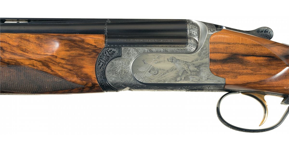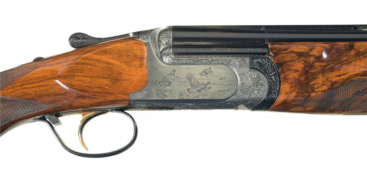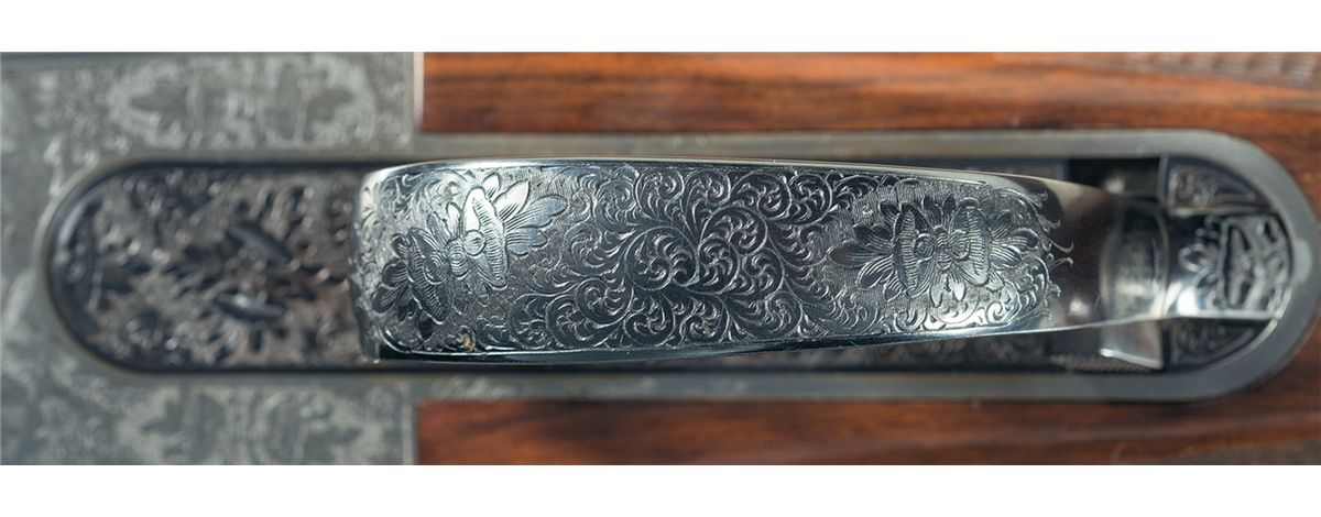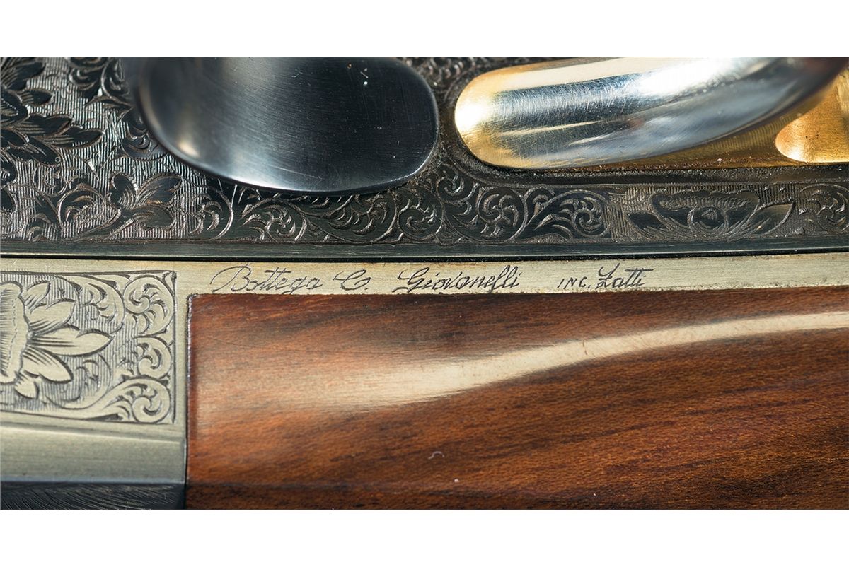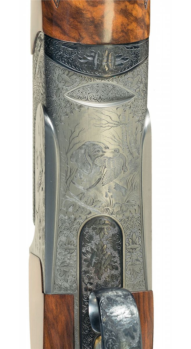 This example has beautiful game scenes engraved on the sides and bottom of the receiver. The left side shows a dog pointing at a partridge taking flight on a grassy hillside (unknown Perazzi engraving number but similar to 19 with a different breed of dog). The right side shows four partridges in flight with farmland behind them (unknown Perazzi engraving number). The underside shows a dog with a dead partridge in its mouth with birch trees behind and to the right (Perazzi engraving number 140). Most of the remaining surfaces of the receiver are engraved with floral scroll. The detachable trigger group is numbered to the gun, has an external selector switch and also has extensive floral scroll engraving. The break lever, safety switch and forearm hardware also have extensive floral scroll engraving. The barrels have a white bead front sight, a nickel middle bead sight, are threaded for factory choke tubes with a "0" and a "4" installed and have 2 3/4 inch chambers with long forcing cones and ejectors. Both barrels are stamped with the bore size "18.4" and the date stamp is "BM" for 1999. Mounted on a beautifully figured, multi-point checkered Turkish walnut forearm and pistol grip stock with factory recoil pad. Length of pull is 14 3/8 inches. Comes with the original leather covered Negrini takedown hardcase, 5 extra factory choke tubes (0,2,6,8,10), a factory choke tube wrench, 2 snap caps, a spare parts kit (2 firing pins with springs, 2 hammer springs and hammer spring tool), 2 Briley Spectrum Ported chokes (IC, LM), Briley choke wrench and stock wrench. 2 3/4 inch chambers, bore diameter: O- .725 U- .725, min. bbl thickness: O- .035 U- .035, length of pull: 14 3/8 inches, drop at comb: 1 5/16 inches, drop at heel: 1 7/8 inches, cast-on: ¼ inches, weight: 8lbs 12oz.