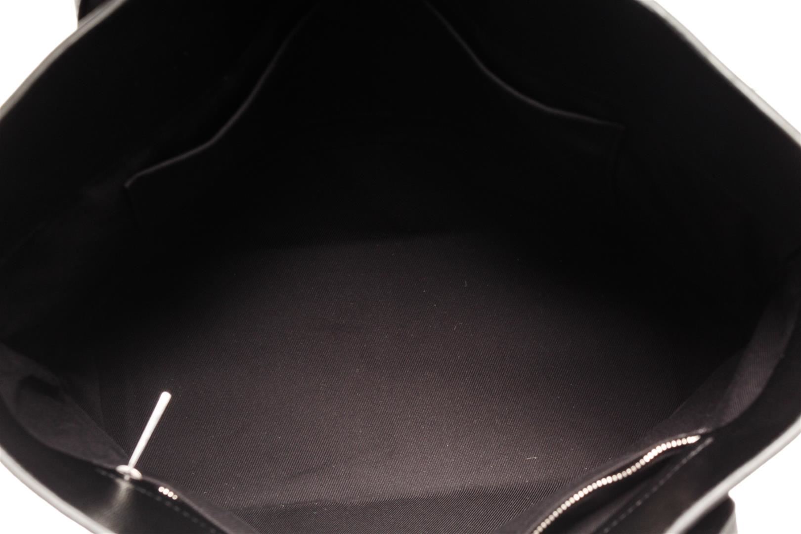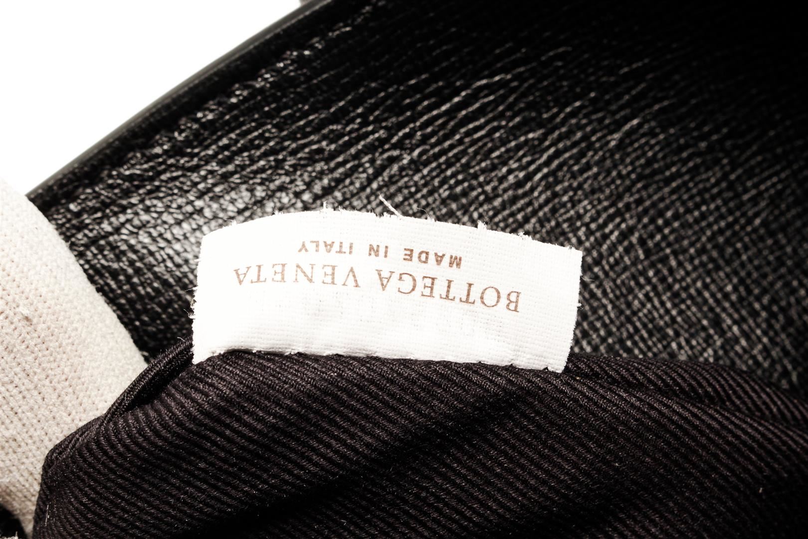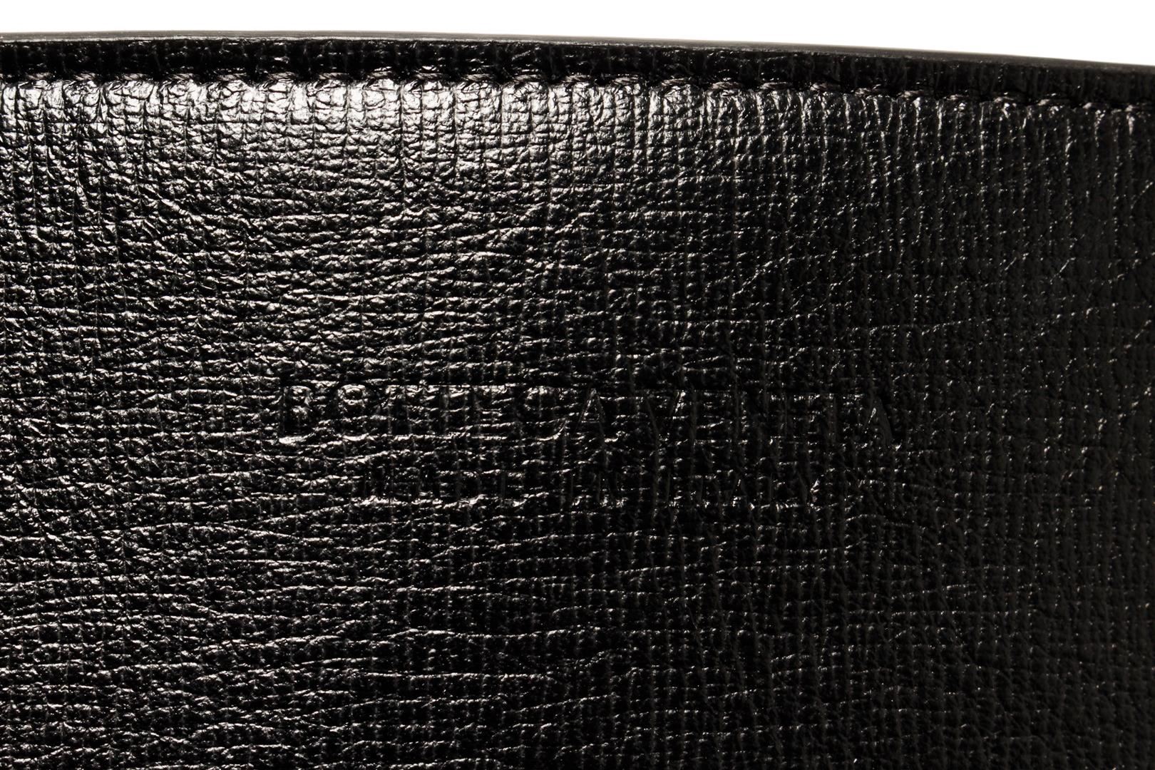 Bottega Veneta Black Leather Open Tote Bag. All available information is listed in the description and shown in the photos. Bottega Veneta Black Leather Open Tote Bag with silver-tone hardware, stitch leather trim, black canvas lining, dual interior slip pockets, dual rolled leather top handles, and zip closure at the top. .