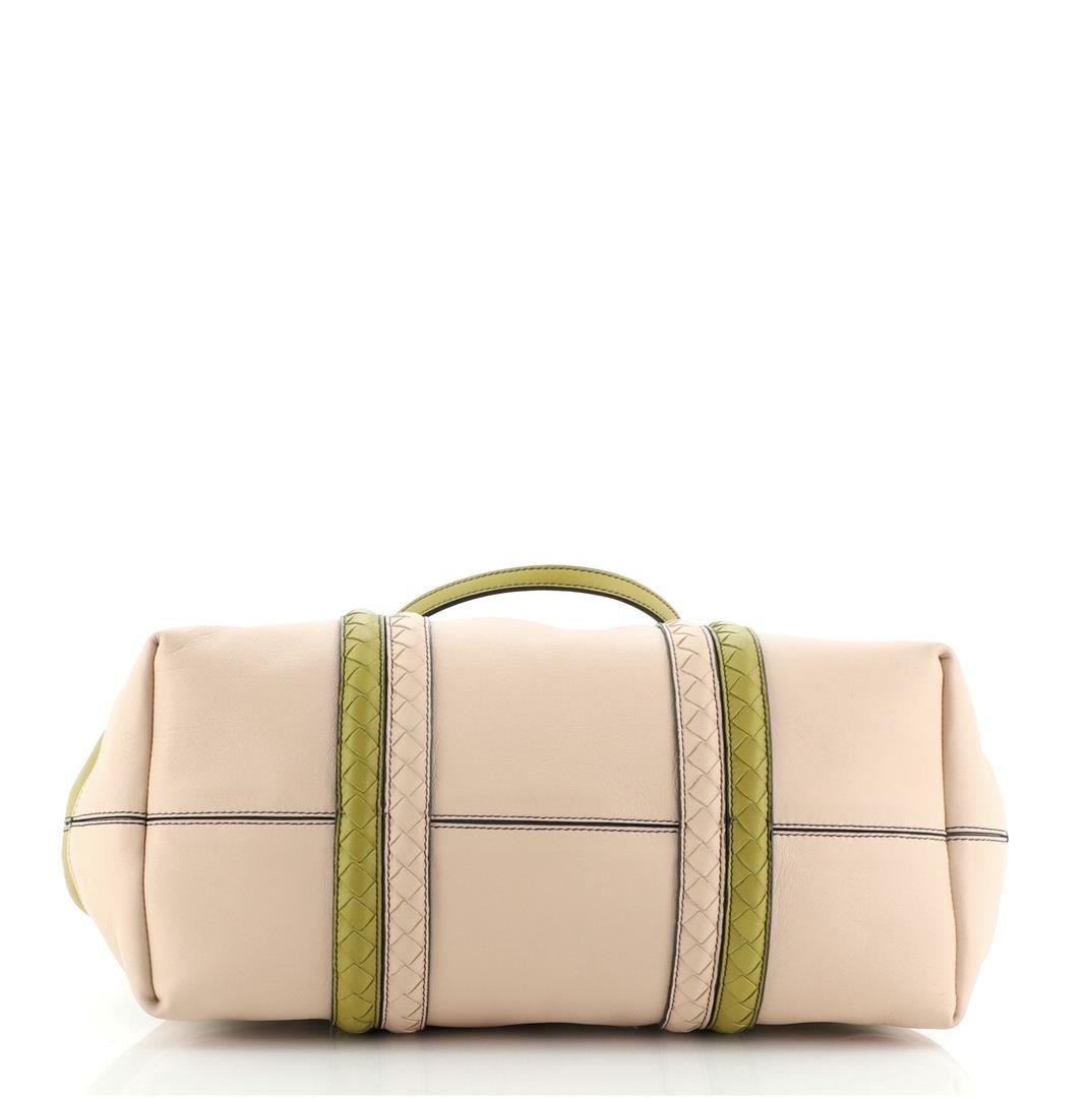 One Bottega Veneta Corso Tote Leather with Intrecciato Detail Green, Multicolor, Pink. Item is sold AS-IS. All available information is listed in the description and shown in the photo. Bottega Veneta Corso Tote Leather with Intrecciato Detail Green, Multicolor, Pink Condition Details: Minor wear and darkening on base corners, creasing and indentations on exterior and interior opening trim. Slight darkening, wear and small stains in interior, scratches on hardware. Height 10", Width 13", Depth 6.5", Strap Drop 9