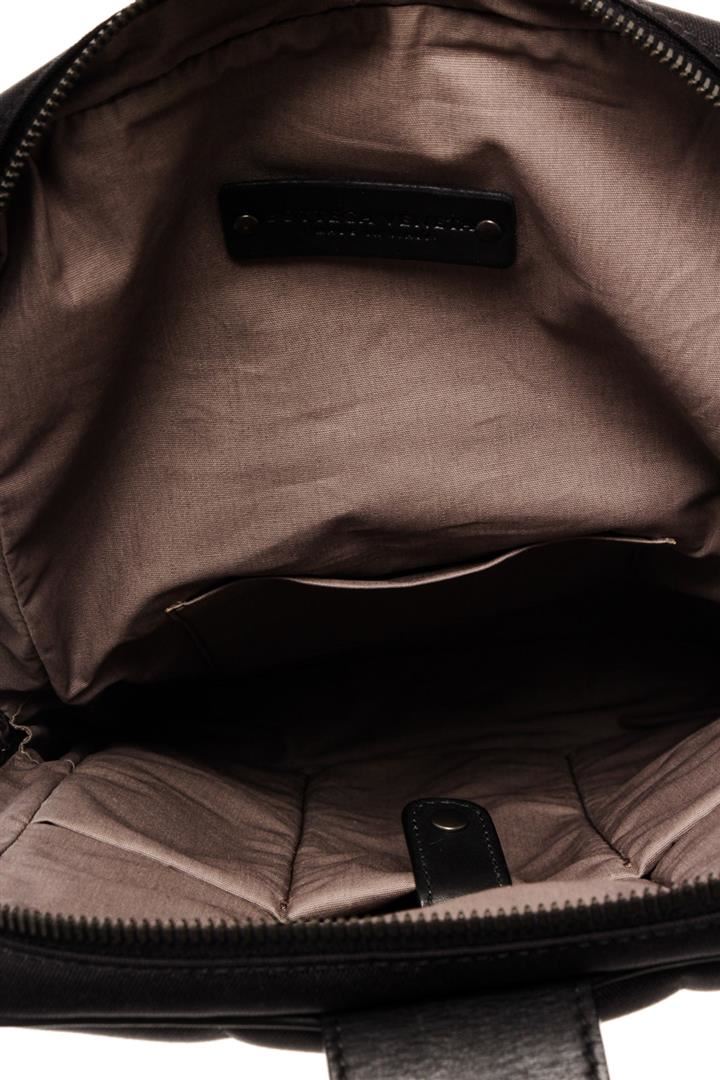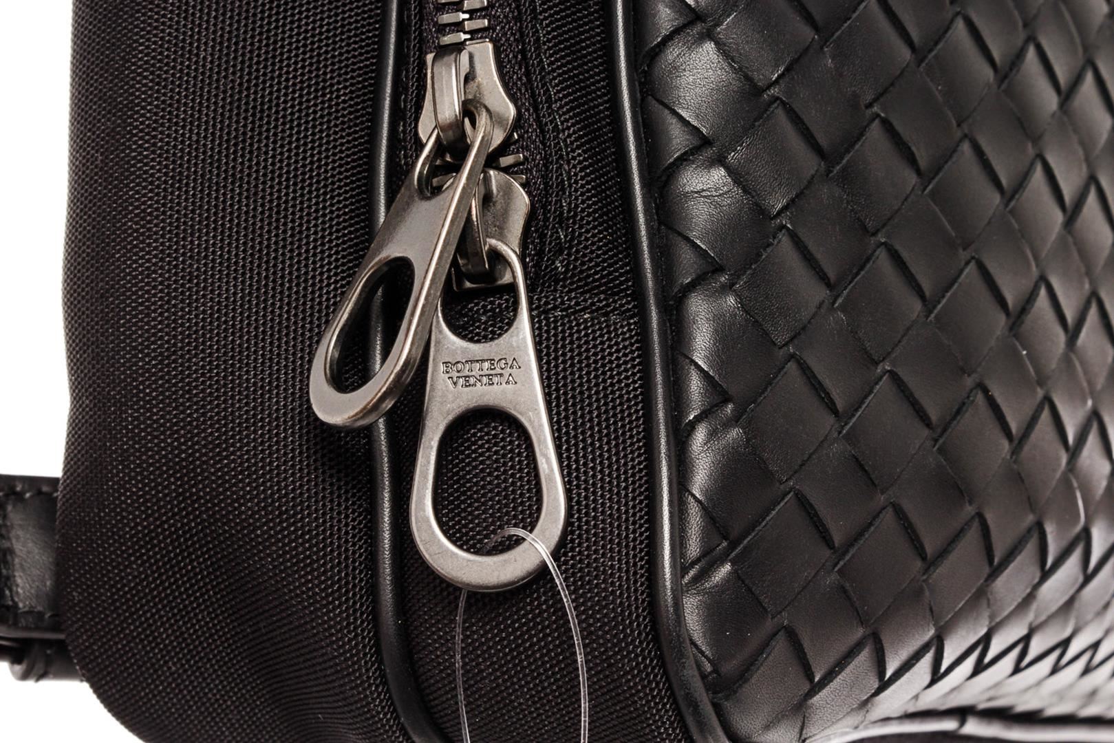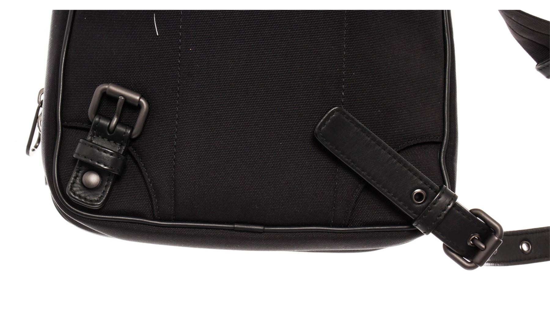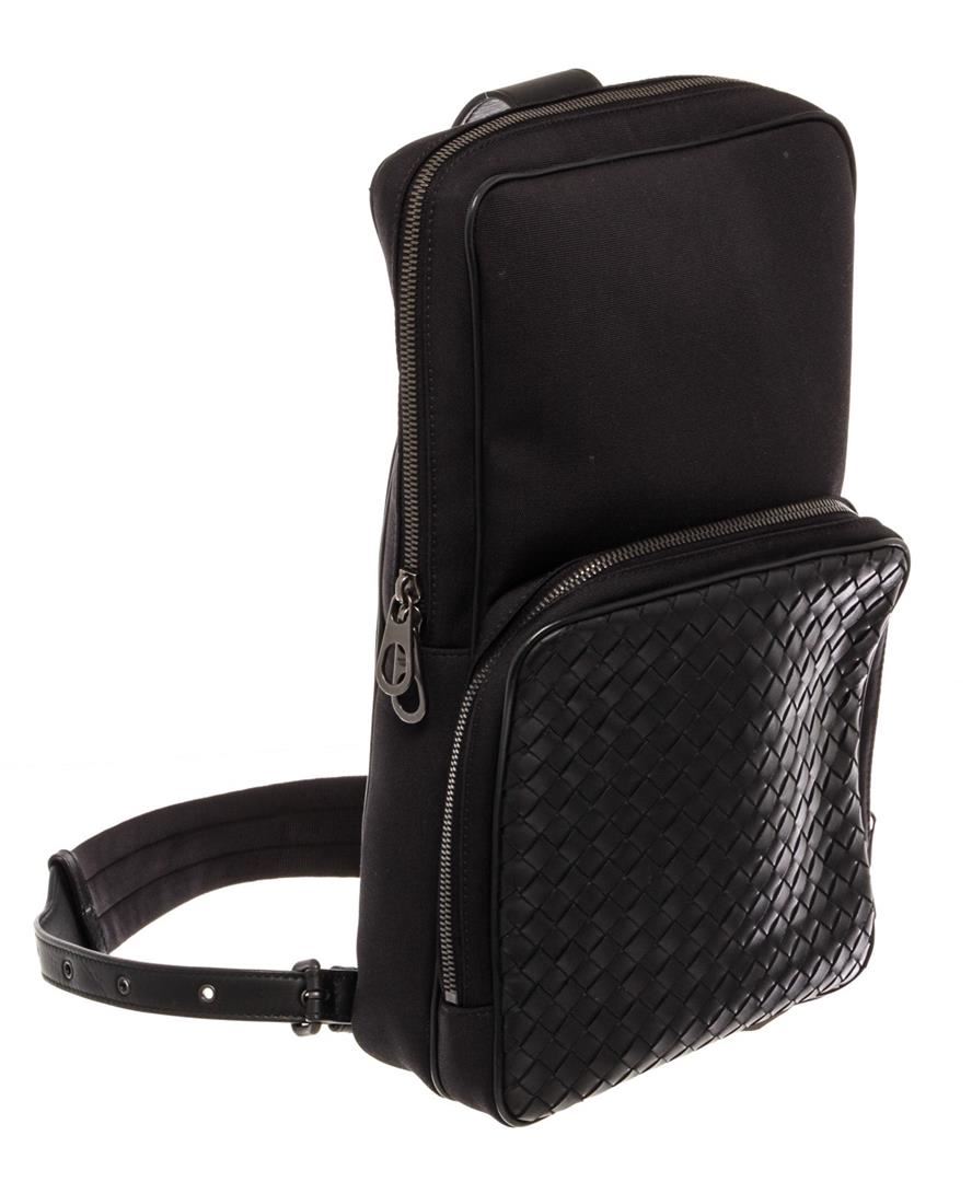 Black canvas Bottega Veneta Nero Hi-tech sling backpack features an all around zip fastening, a woven front zip pocket with a signature leather intrecciato weave, internal slip pockets, an internal logo patch and a shoulder strap. 13.5" x 5" x 12