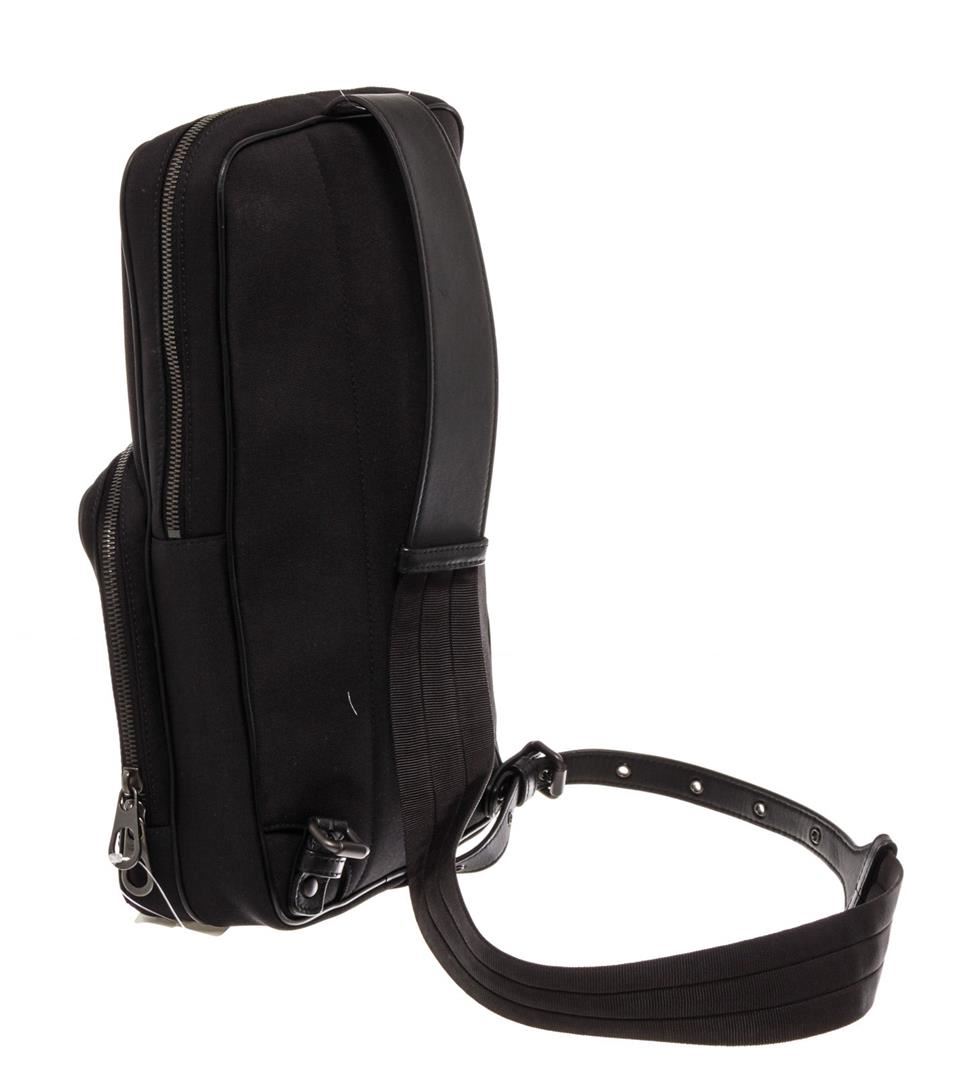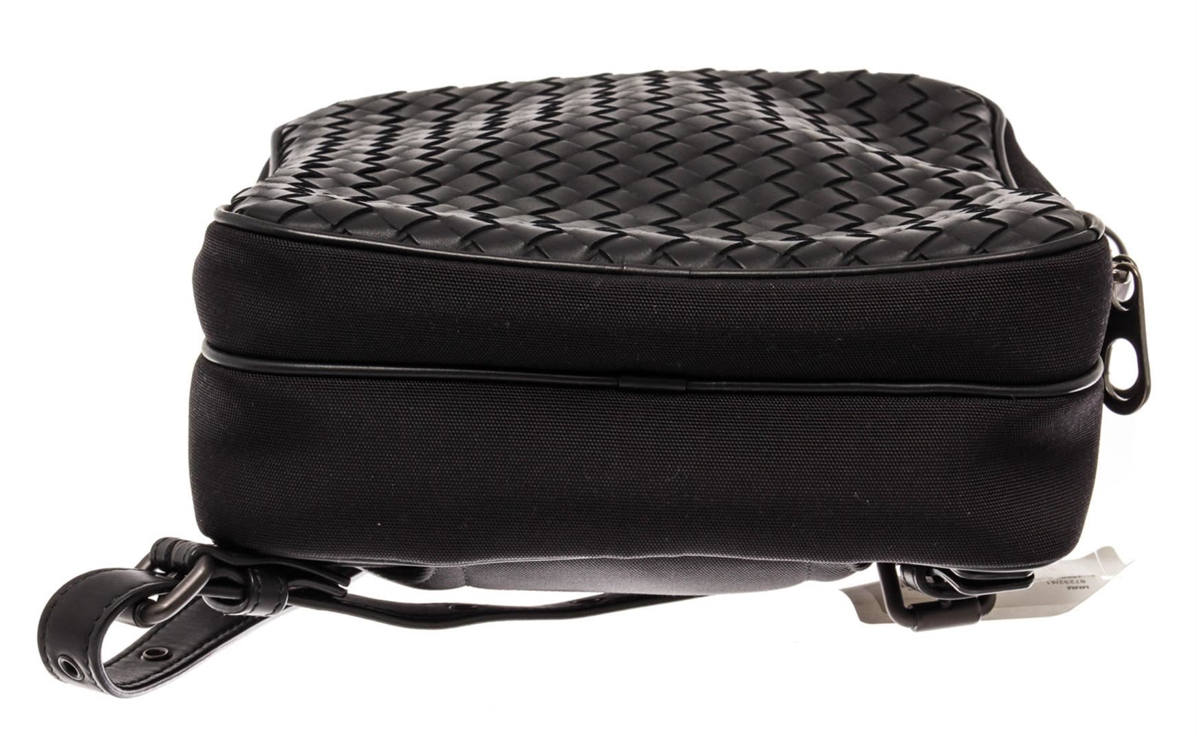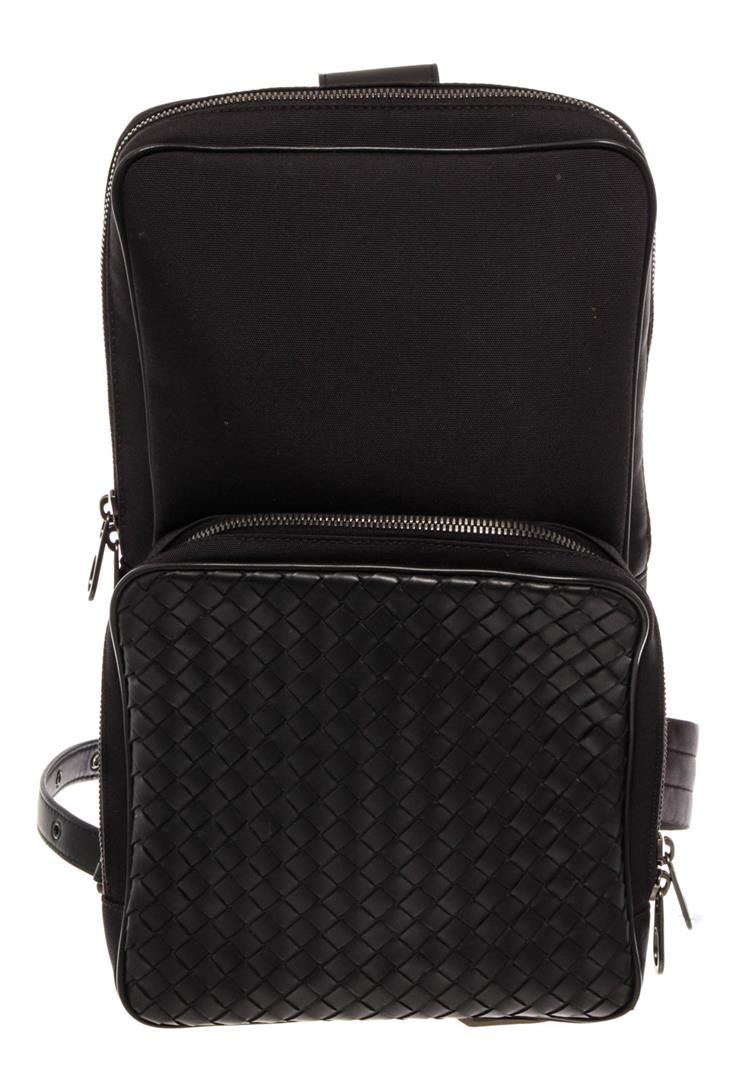 Black canvas Bottega Veneta Nero Hi-tech sling backpack features an all around zip fastening, a woven front zip pocket with a signature leather intrecciato weave, internal slip pockets, an internal logo patch and a shoulder strap. 13.5" x 5" x 12