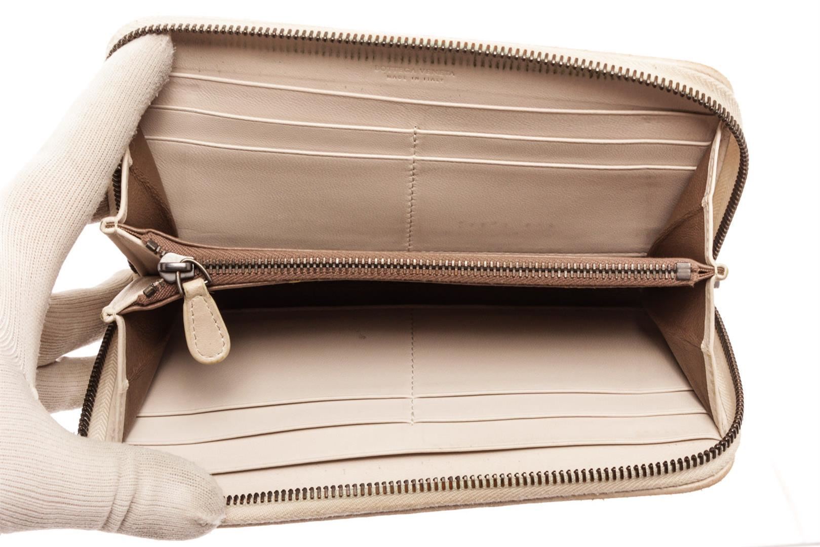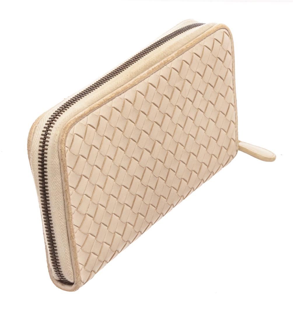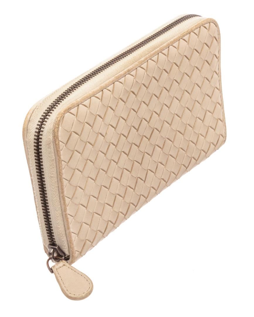 Bottega Venetta Cream Leather Zip Around Wallet with gold-tone hardware, trim leather, interior zip pockets, top handle and zip closure.