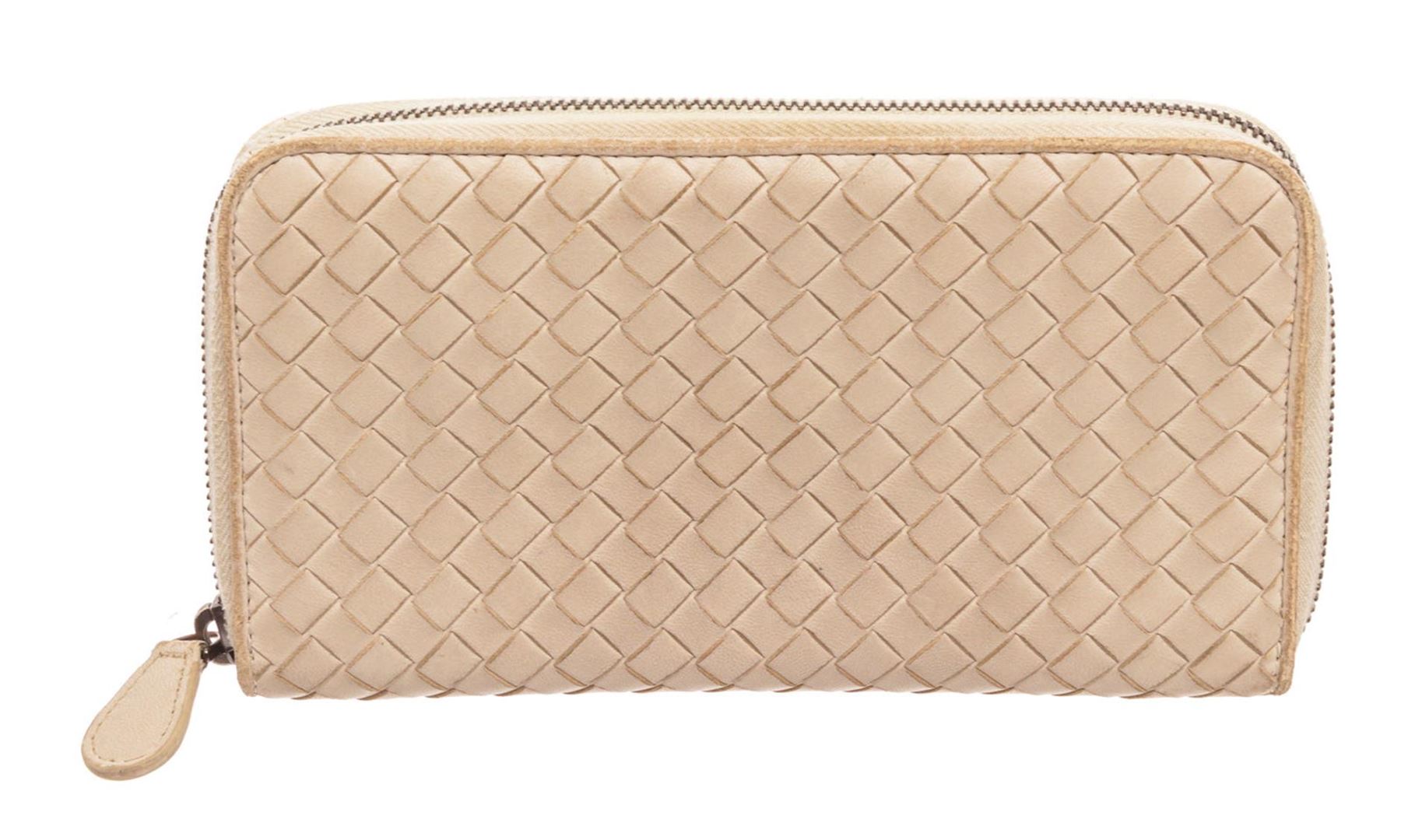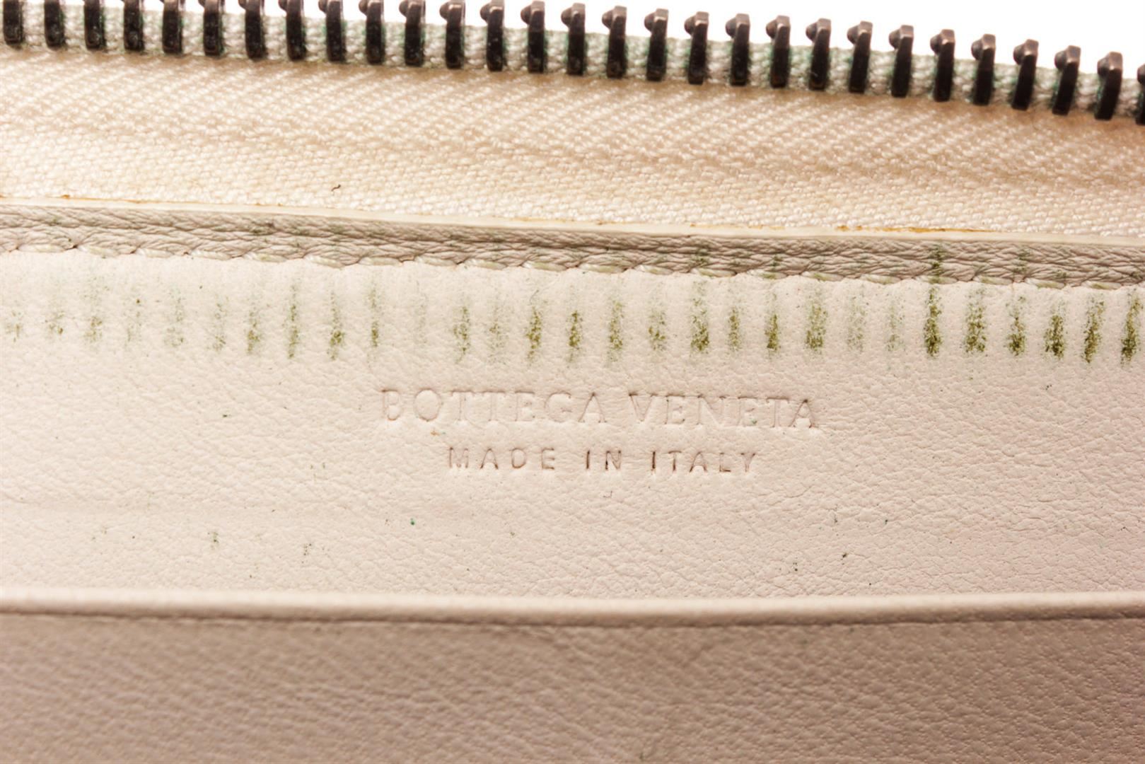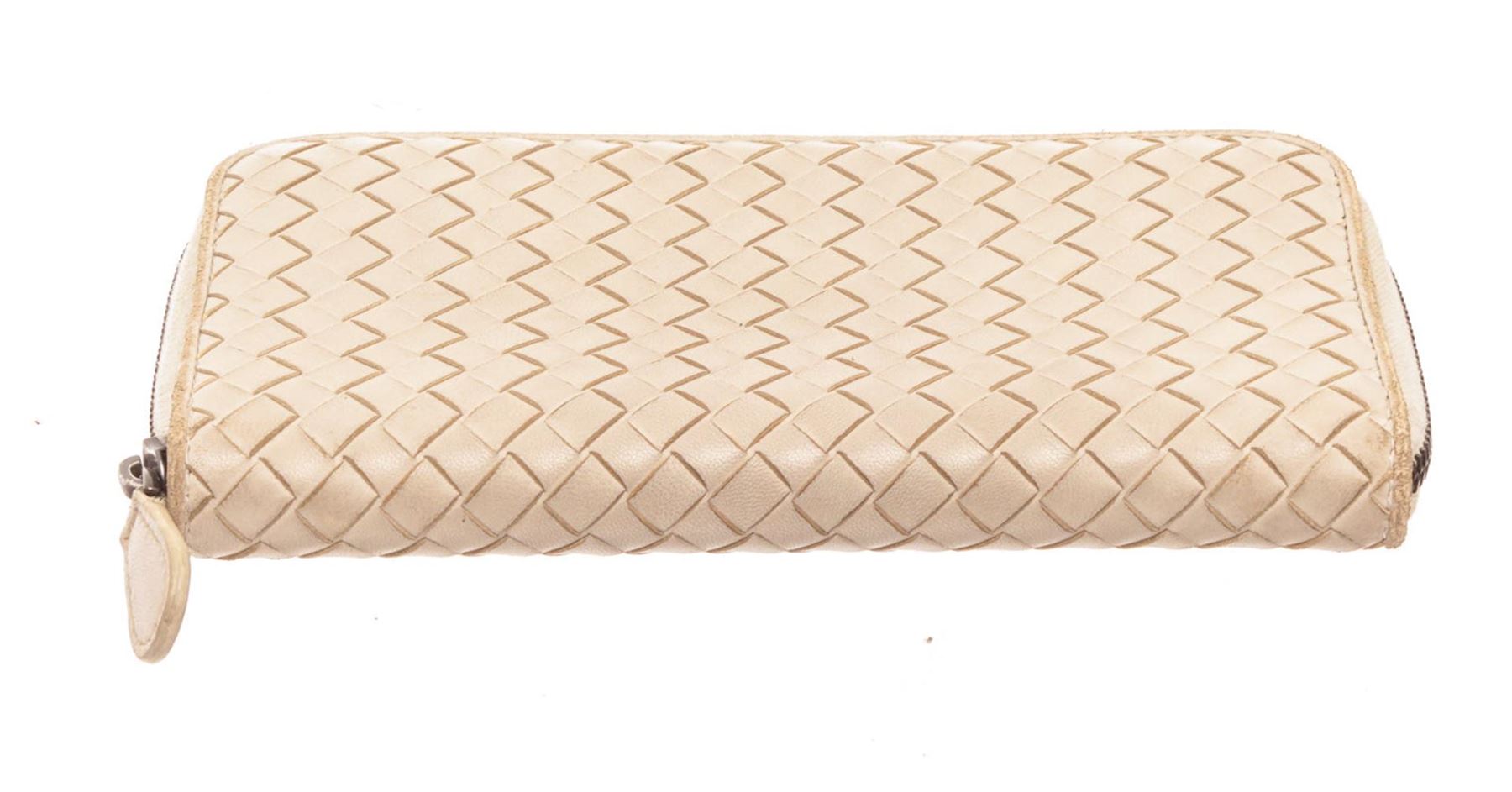 Bottega Venetta Cream Leather Zip Around Wallet with gold-tone hardware, trim leather, interior zip pockets, top handle and zip closure.