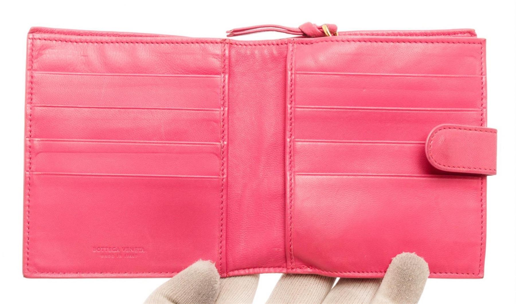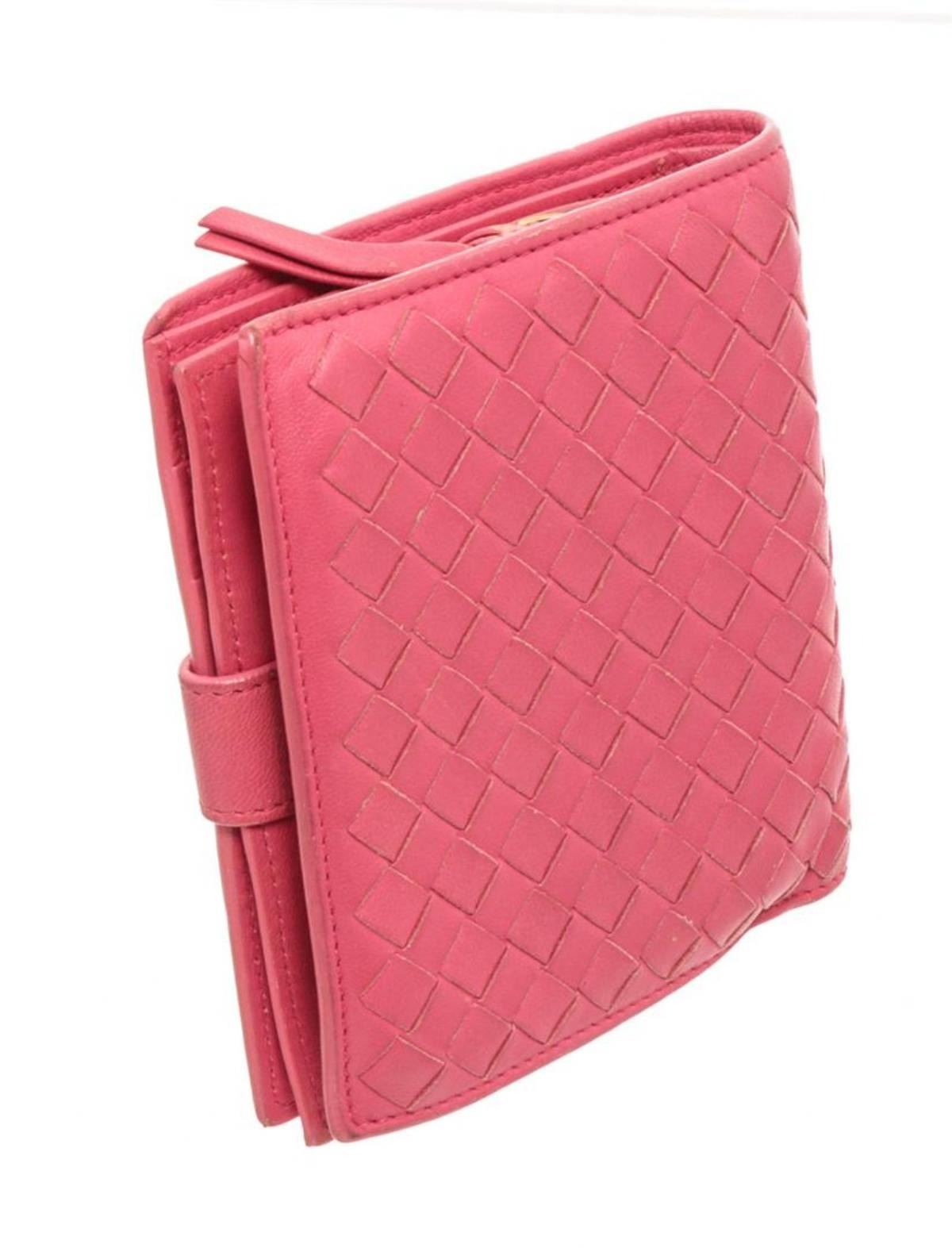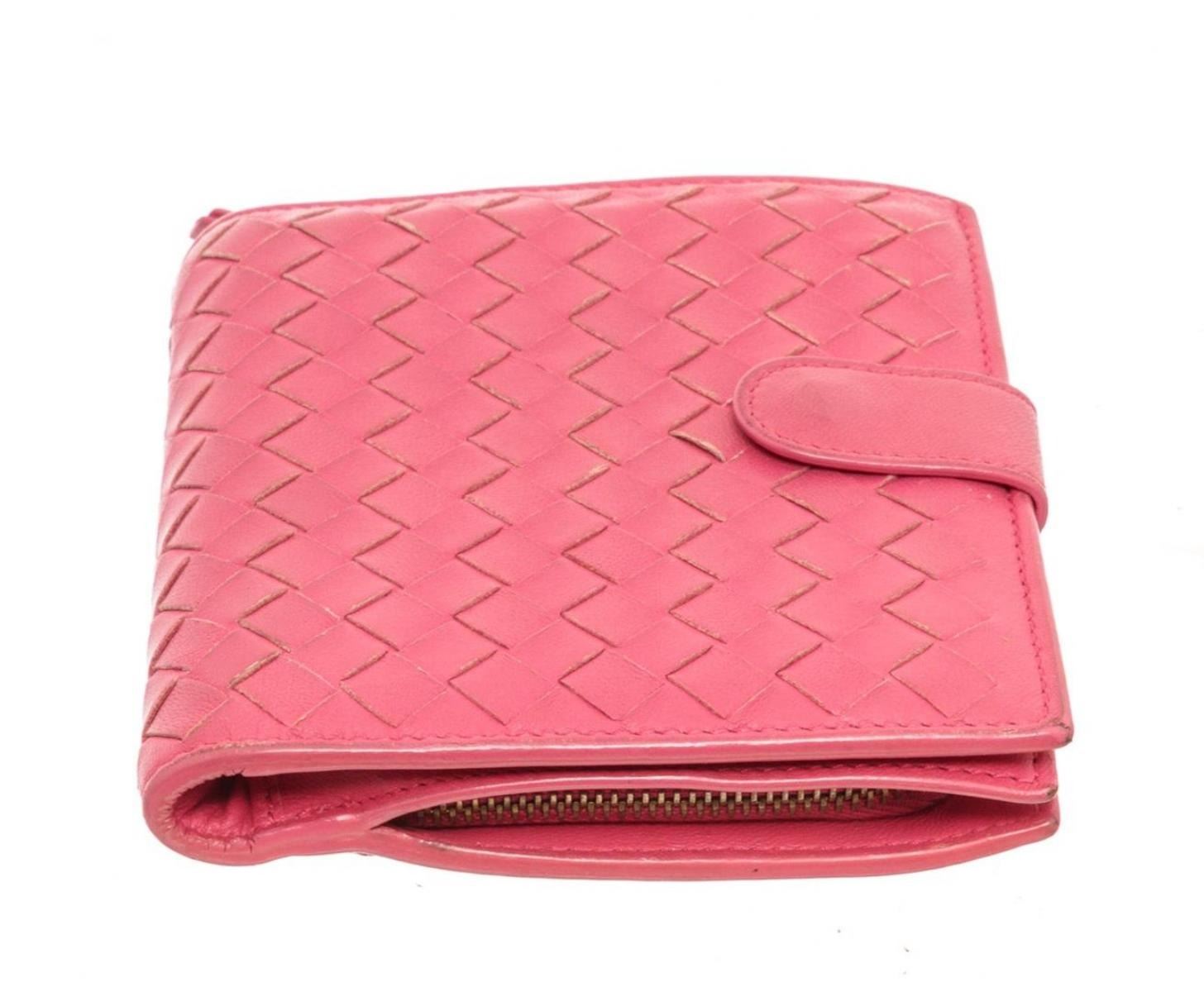 Bottega Venetta Pink Leather Compact Wallet with silver-tone hardware, tonal leather lining, interior compartments pockets, snap closure.