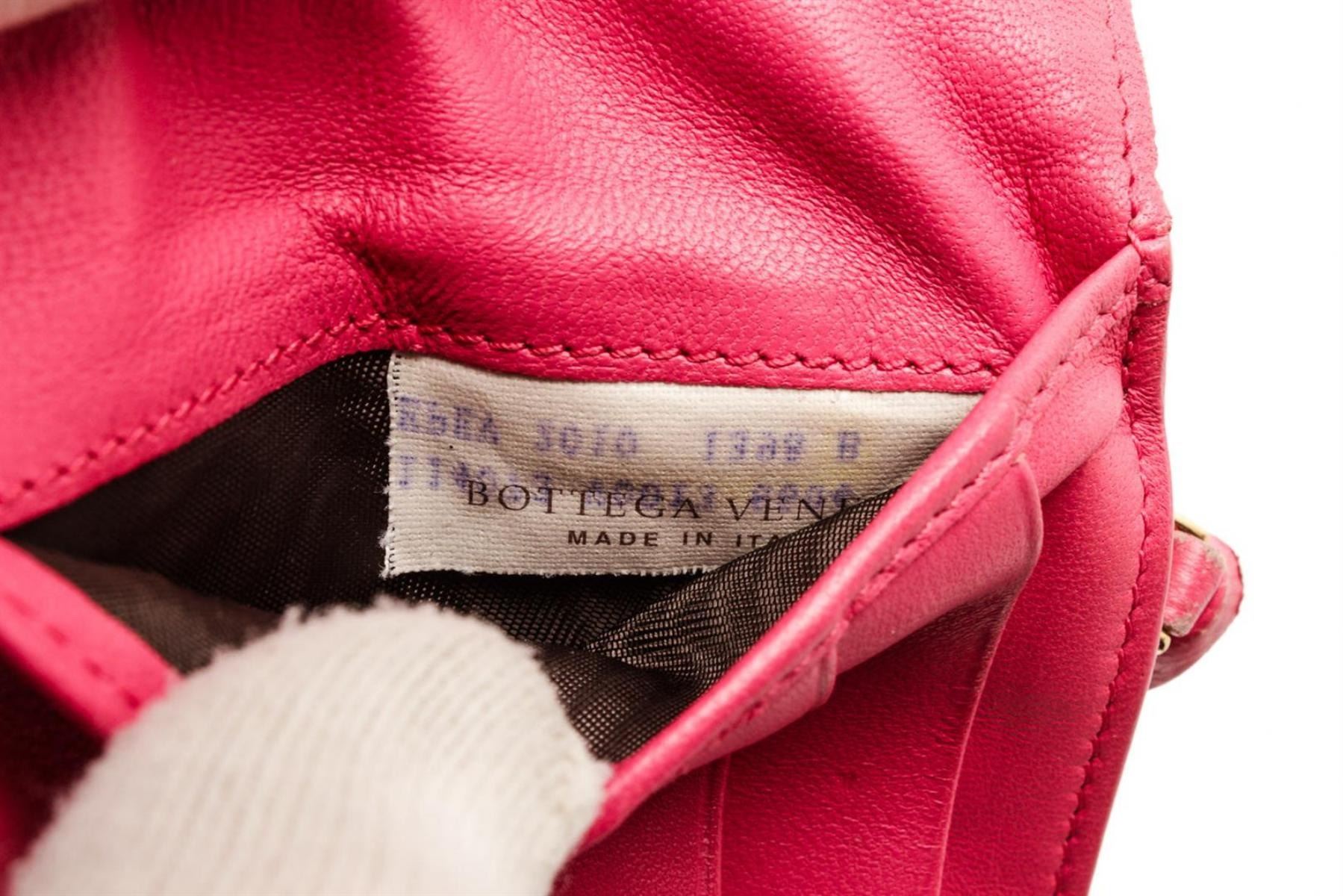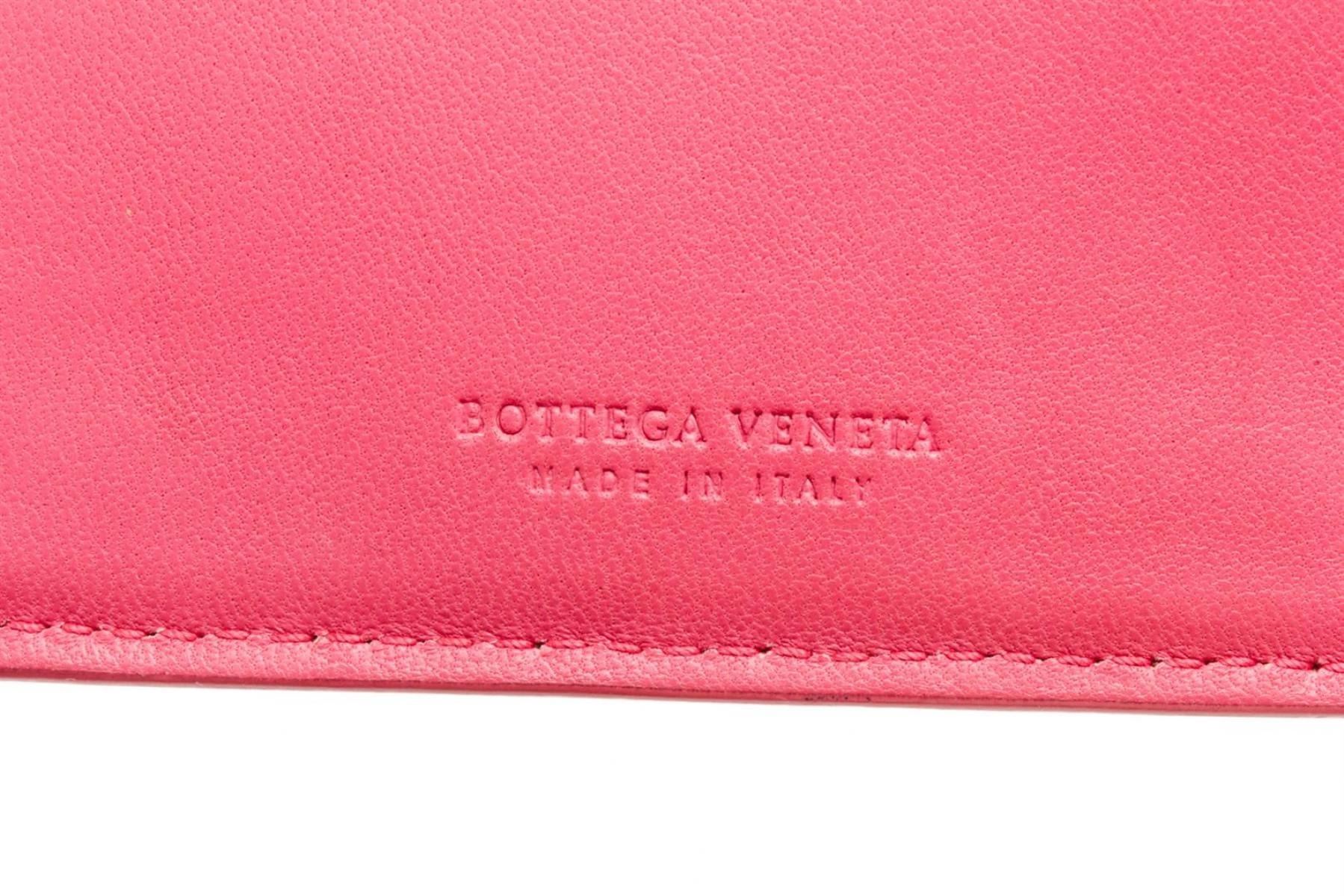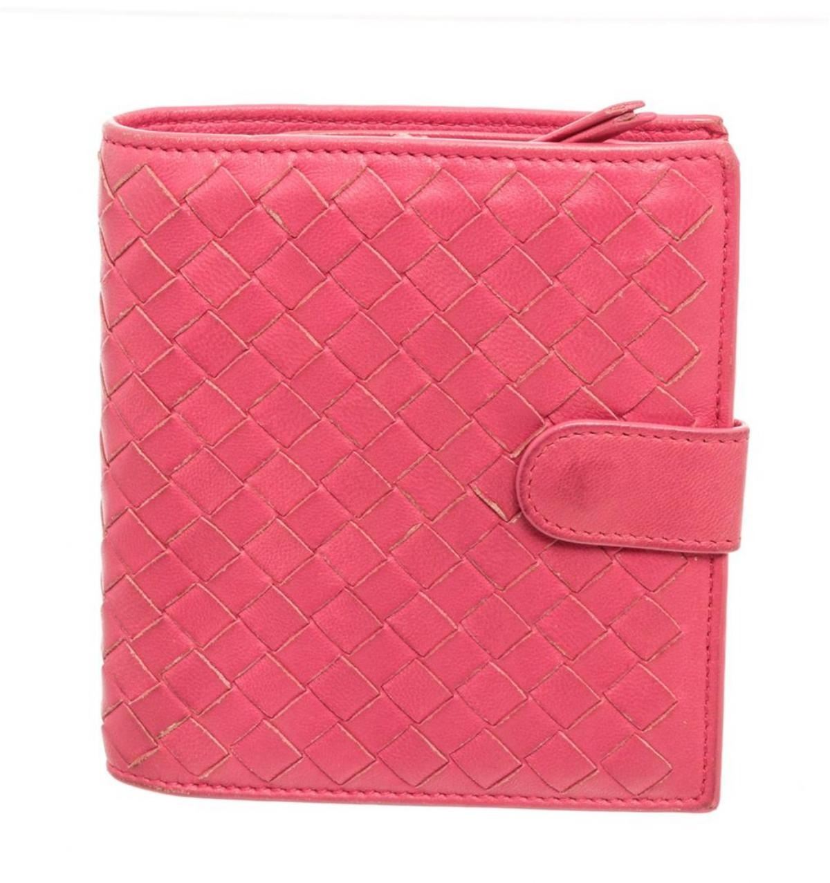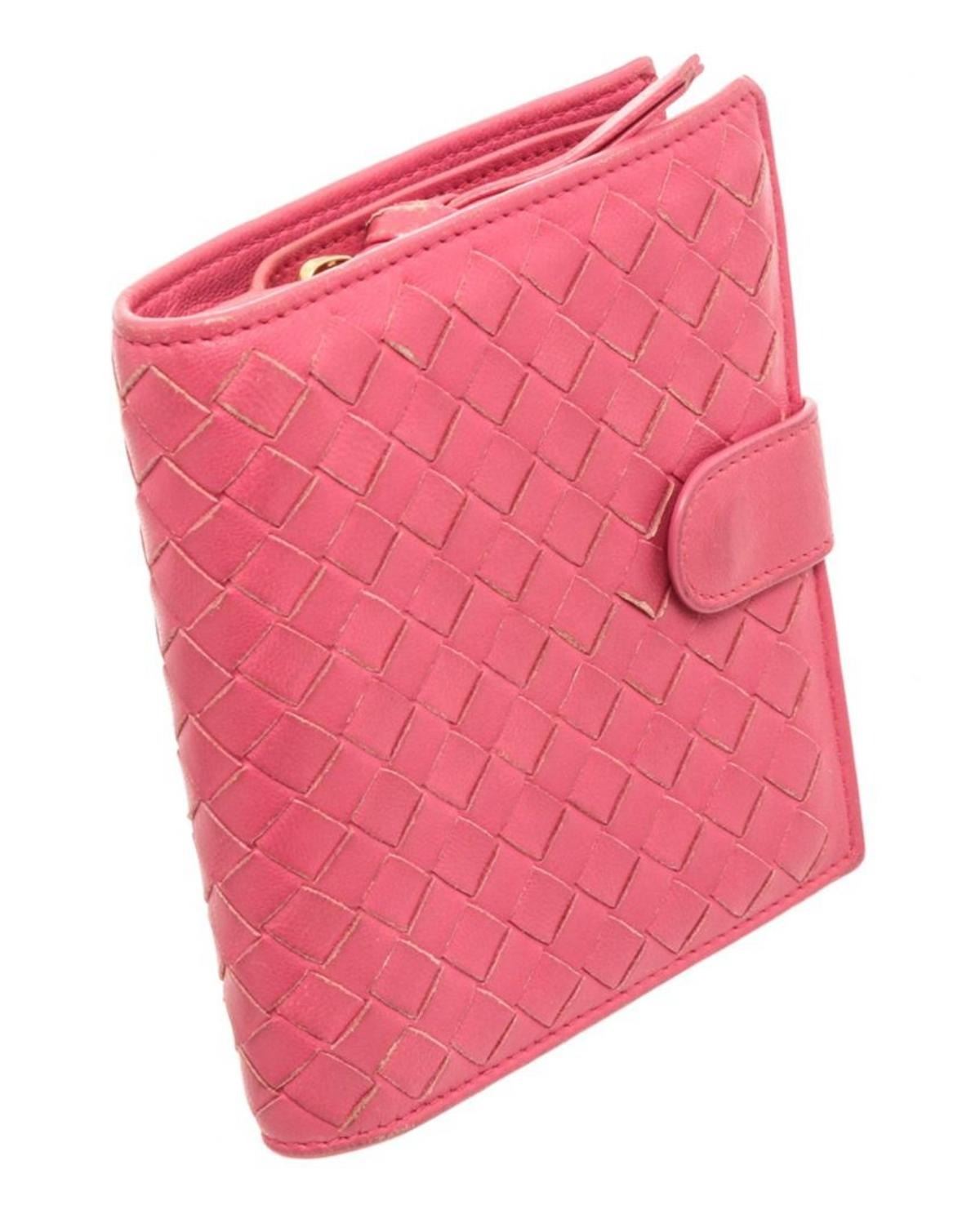 Bottega Venetta Pink Leather Compact Wallet with silver-tone hardware, tonal leather lining, interior compartments pockets, snap closure.
