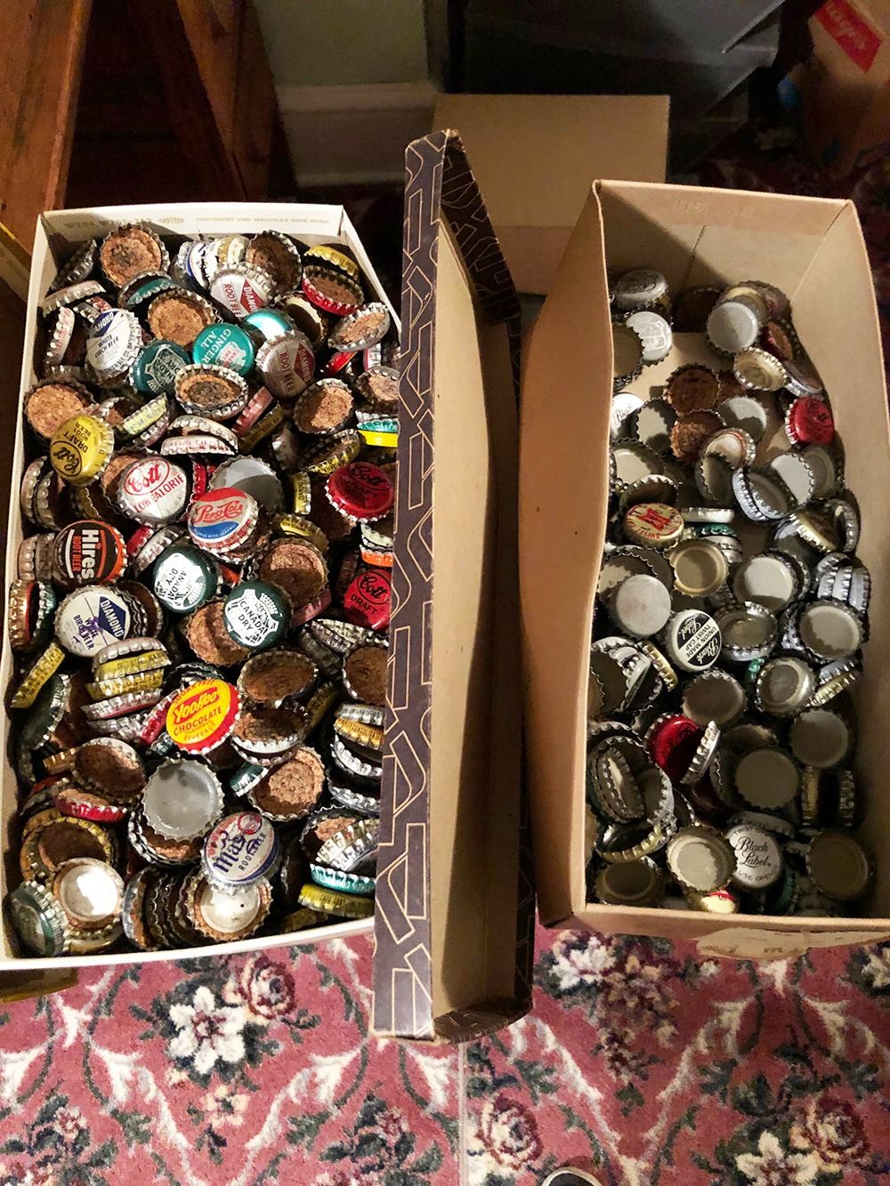 Bottle cap collection, 2 boxes of bottle caps, being sold as found at the estate.