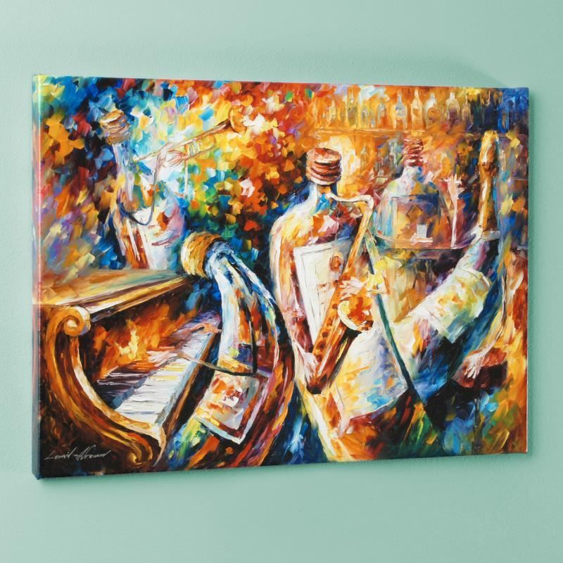 Leonid Afremov's (1955-2019) masterful use of color and texture make his paintings unique collectibles that are sure to brighten any wall. "Bottle Jazz I" is a limited edition giclee on canvas. The piece is numbered and bears the artist's authorized signature. This piece comes gallery wrapped. Includes Letter of Authenticity. Measures approx. 24" x 18" (image). This item requires special handling and may have a longer than usual turnaround.