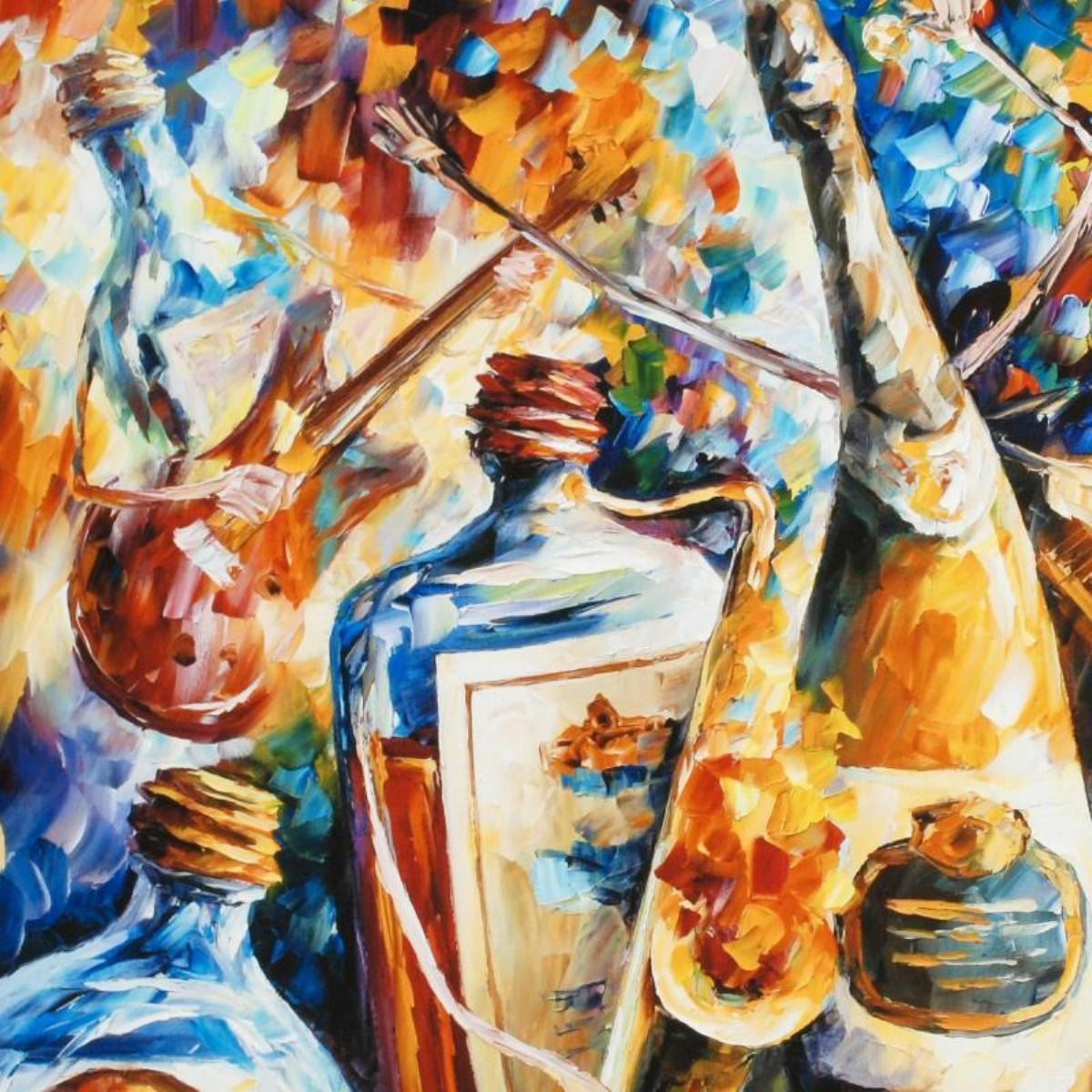 Leonid Afremov's (1955-2019) masterful use of color and texture make his paintings unique collectibles that are sure to brighten any wall. "Bottle Jazz IV" is a limited edition giclee on canvas. The piece is numbered and bears the artist's authorized signature. This piece comes gallery wrapped. Includes Letter of Authenticity. Measures approx. 18" x 24" (image).