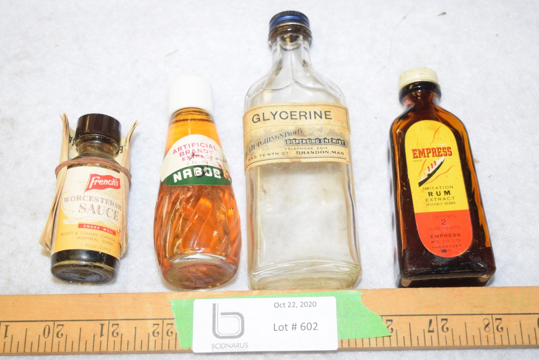 Bottle of Glycerin (Brandon), Nabob Brandy Extract, Empress Rum Extract and Frenches Worcestershire