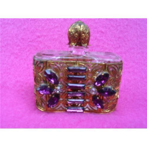 There are 6 sparkling purple stones that are set off gorgeously by 2 clear stones highlighted by goldish ornate metal. A real stunning delicate bottle.