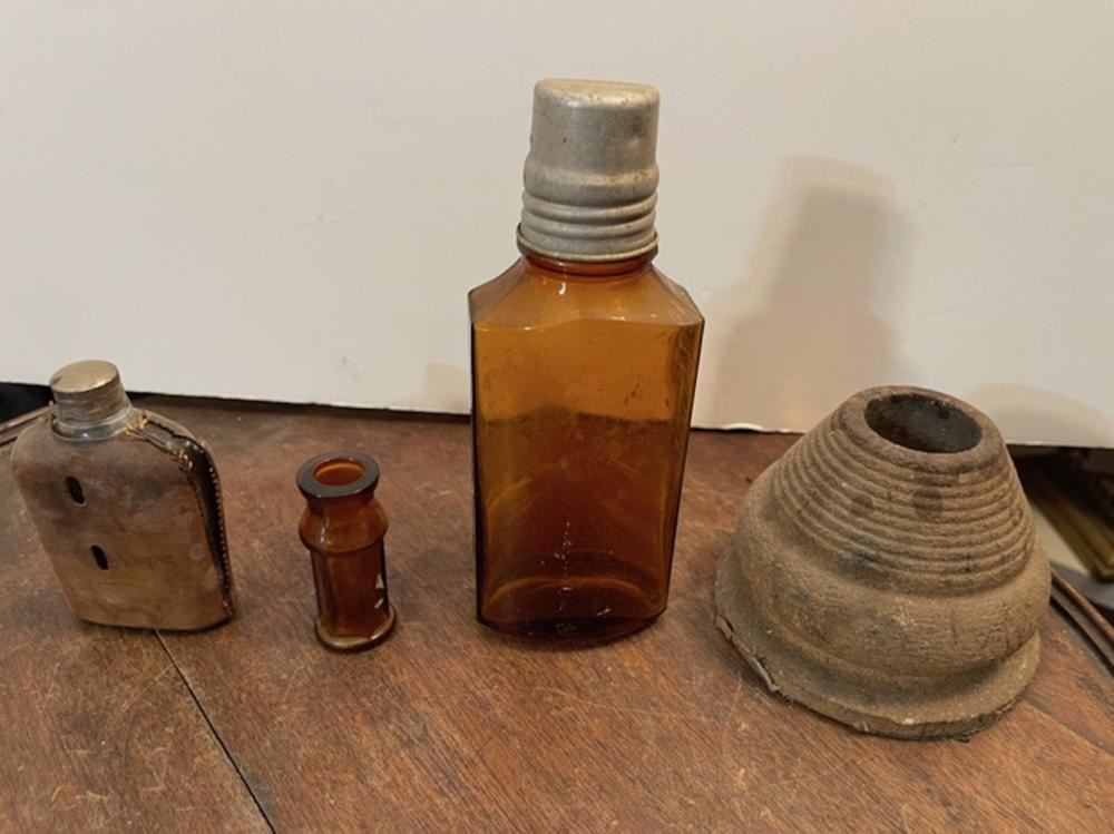 2 Medicine bottles, one marked Horners, Sharp and Dohme, Baltimore poison bottle, Norton and Co., Worchester, Mass. stoneware inkwell, Miami, Florida pocket flask.