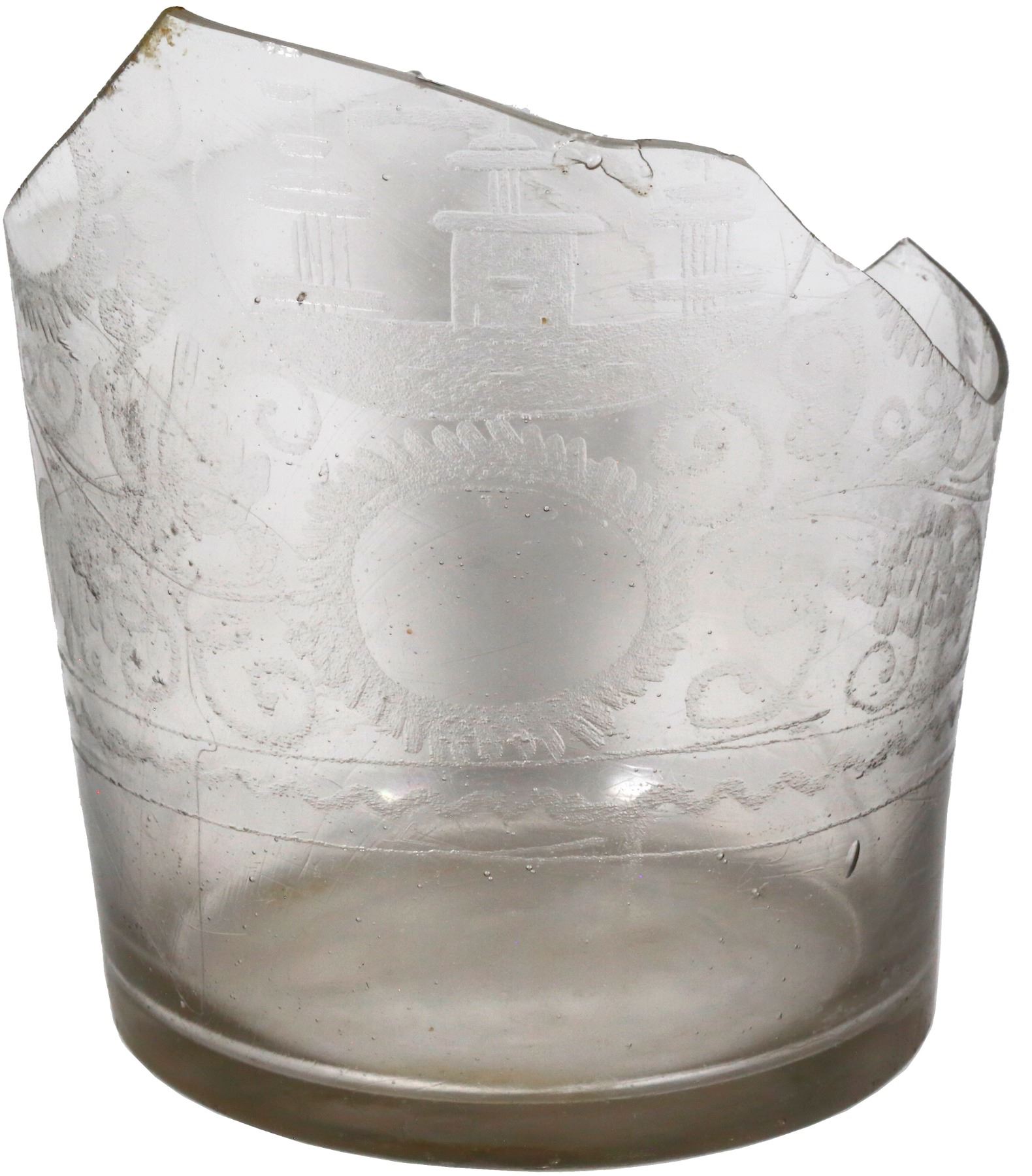 Bottom part of a large glass pitcher etched with floral pagoda scene, ex-Guadalupe and Tolosa (1724)