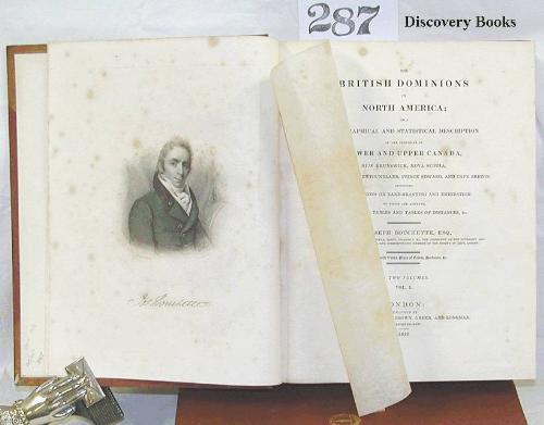 Bouchette, Joseph. THE BRITISH DOMINIONS IN NORTH AMERICA; A TOPOGRAPHICAL AND STATISTICAL DESCRIPTION OF THE PROVINCES OF LOWER AND UPPER CANADA, NEW BRUNSWICK, NOVA SCOTIA, ISLANDS OF NEWFOUNDLAND, PRINCE EDWARD & CAPE BRETON ……WITH …… A TOPOGRAPHICAL DIOCTIONARY …… London: Longman, Rees, Orme, Brown, Green & Longman 1832 3 vols in 2 4to. xxvi(2),498; xi(1),296(8); xii,(358)pp. Frontis port., 30 engraved plates, maps & plans. Bound in later half calf & cloth, spines gilt with raised bands & leather labels. A few plates foxed, but overall a very nice copy, with the bookplate of J. Lamont of Knockdow, author of "Seasons With the Sea Horses". (2)