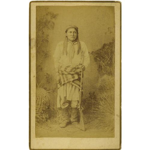 <B>Boudoir Card - Studio portrait of Chatto, Chiricahua Apache</B></I><BR>Spring, 1884<BR>Length 8 1/2 in. Width 5 1/4 in.<BR><BR>Chatto is posed with a wool blanket wrapped around his waist and holding a rifle. In March, 1883 Chatto and Bonito led twenty-six Chiricahua warriors on a series of lightning raids in southern Arizona and New Mexico. Pursued by General George Crook and the United States Army, they fled over the border into the Sierra Madre mountains of Mexico. Eventually, negotiations were conducted and arrangements made for their surrender. In February, 1884 Chatto and his band crossed back into Arizona where, under military escort, they were returned to the San Carlos Reservation. Frank Randall took this photograph shortly thereafter. Chatto later became a sergeant in General Crook's regiment of Apache scouts.<BR>Photo by Frank Randall, Wilcox, Arizona Territory, with his studio imprint stamped in purple ink on the reverse. A separate typed note is pasted on the reverse stating "Entered according to act of Congress in the year 1884, by A.F. Randall in the office of the Librarian of Congress, at Washington." Also, written in period script "Chatto Chiricahua Apache Chief".<BR><BR>