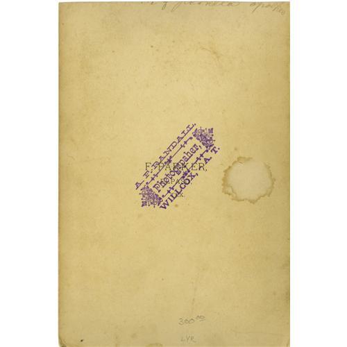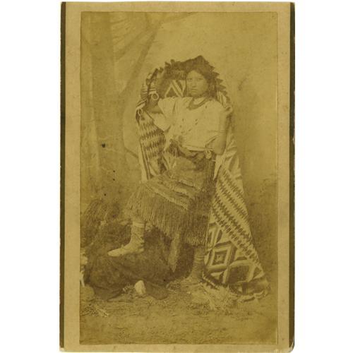 <B>Boudoir Card - Studio portrait of a Chiricahua Apache woman</B></I><BR>Spring 1884<BR>Length 8 in. Width 5 1/4 in.<BR><BR>The Apache woman is posed with a Mexican Saltillo serape held above her shoulders. She is wearing a cloth blouse, a hide skirt elaborately decorated with rows of tin cones and fringe, and a knife case is fastened to her belt. Photograph by A. Frank Randall, Wilcox, Arizona Territory with his studio imprint stamped in purple ink on the reverse.<BR><BR>