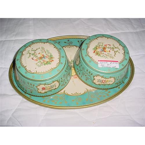 This is a three-piece boudoir set, two bowl containers 2x5, and one tray, 8x11.50, made of tin which has a shiny finish, decorated with an attractive blue and gold trim, with a centered floral design. The inside of the bowls are heavy celluloid. The only flaw is in the bottom interior of one bowl where the celluloid has worn away from usage. (see the picture). There are no dents and/or scratches to mar its beauty.