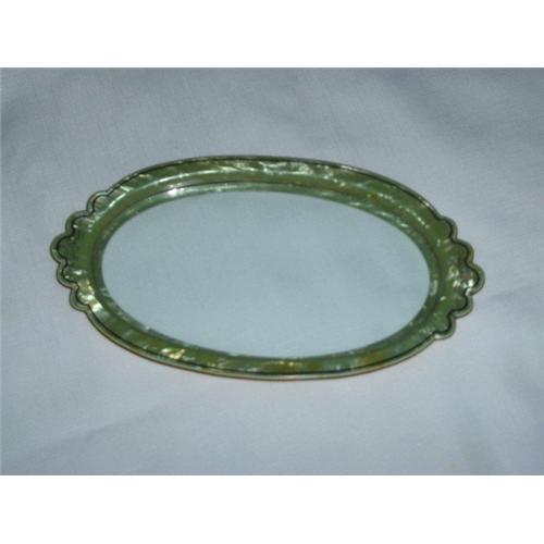 A nice green pearl on amber celluloid boudoir tray. This comes from the 30's. It is the Queen Anne pattern, made by Pyrocel. The pearl design comes from fish scales added to the celluloid. The tray is in good condition, it has some yellowing spots. There is a flower and leaves at each end and a glass bottom. See photos. Take a look at my other items. Thank you for viewing.