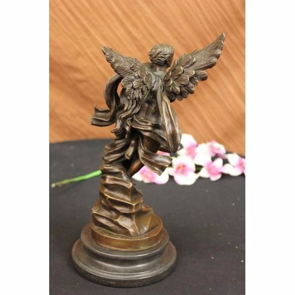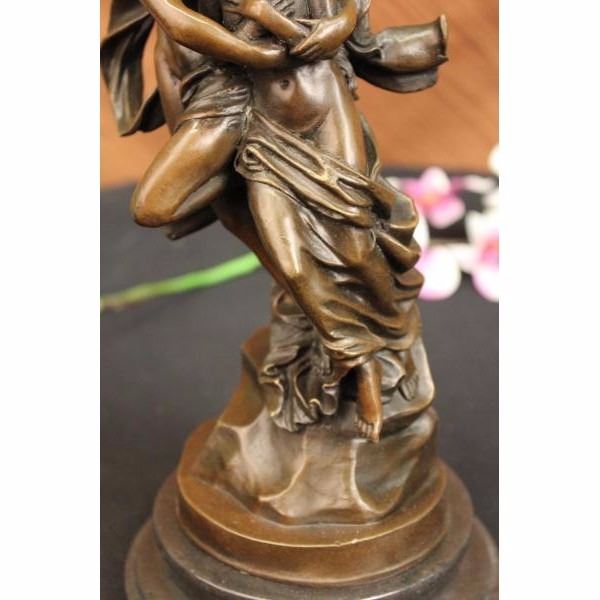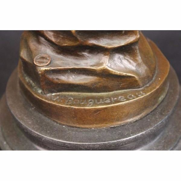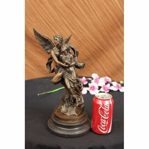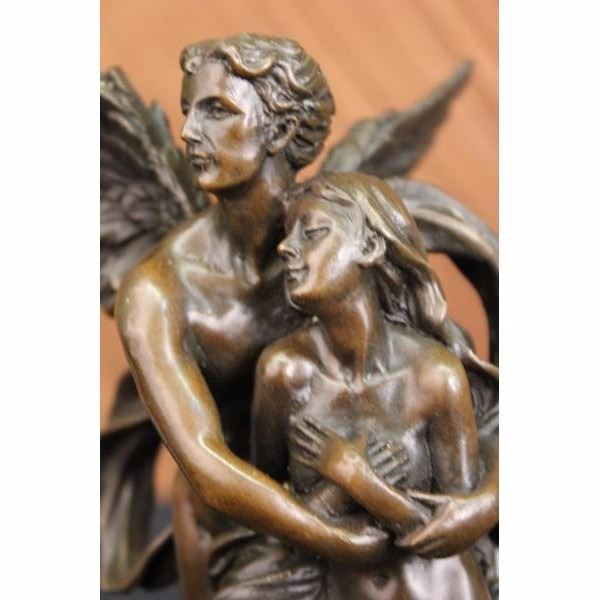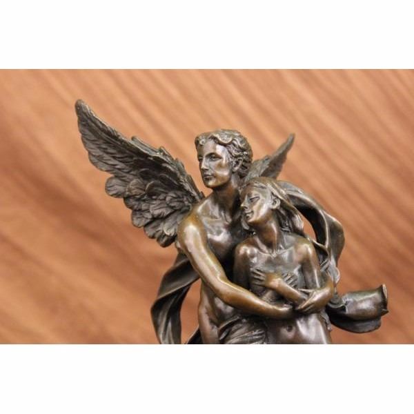 THIS LOVELY SCULPTURE OF THIS ROMANTIC COUPLE IS ONE FOR THE FICTION TALES. CUPID AND PSYCHE EMBRACE EACH OTHER AT LAST. HIS WINGS SPREAD OUT AND HE FLIES INTO THE SKY WITH HIS BELOVED IN HIS ARMS, HE IS GRATEFUL FOR WHAT HAS CAME IN TO HIS LIFE AFTER SO MANY YEARS OF HIM MAKING OTHERS FALL IN LOVE HE FINALLY HAS A LOVE TO CALL HIS OWN. CAST IN BRONZE, SET ATOP A BLACK MARBLE BASE. SIGNED "DEBUT." THIS PIECE IS A MUST-HAVE THAT WILL SURELY BE TREASURED FOR YEARS TO COME, FEATURING THE LOST WAX METHOD OF CASTING, FOUNDED THOUSANDS OF YEARS AGO ENSURING AN EXQUISITELY DETAILED SCULPTURE THAT WILL ADD GRACE AND BEAUTY TO YOUR BUSINESS OR HOME AND IS SIGNED BOUGUEREAU. Condition: This sculpture is in perfect condition. Bronze Dimensions with Marble Base:Height 13" x Width 6" Marble Dimensions:Diameter 6" Height without base: 11" Weight :10 LBS Inventory : 35Y077A4253