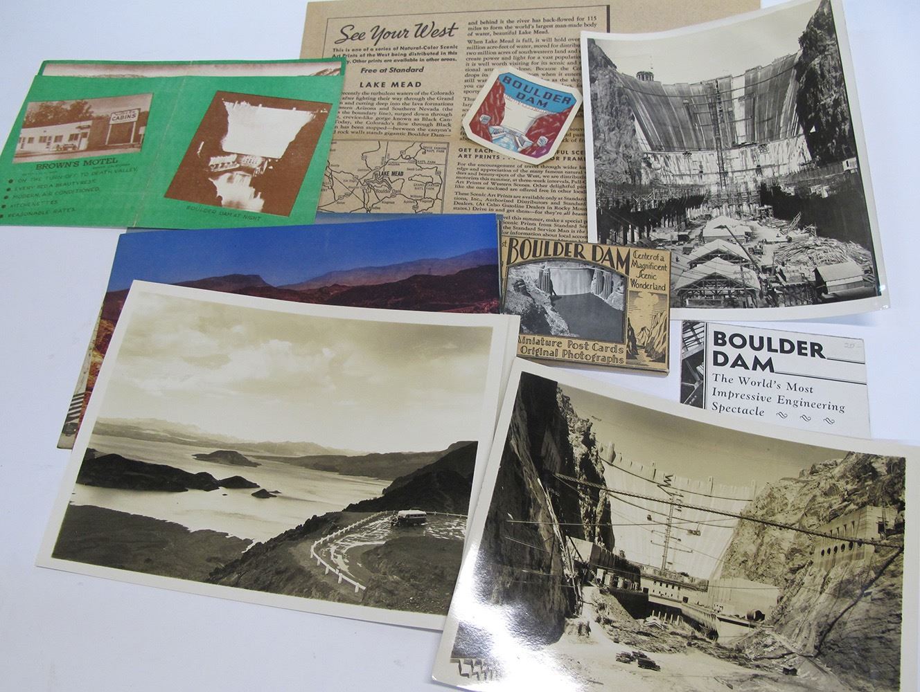 Brown's Motel and Desert Map brochure. 4 nice b/w 8" x 6.5" photos. 9" x 11.75" Standard Oil color view of Lake Mead in promo envelope. 3 6.25" x 9" color dam postcards. 6 panel b/w foldout brochure of dam area natural attractions. 18 miniature postcards in cardboard case, 3" x 4.5". Date: Location: Boulder, Nevada HWAC # 55722