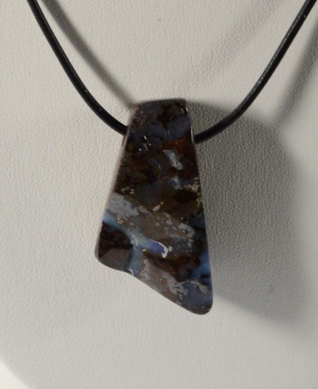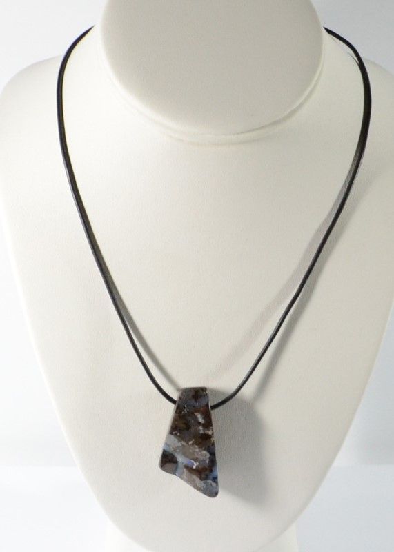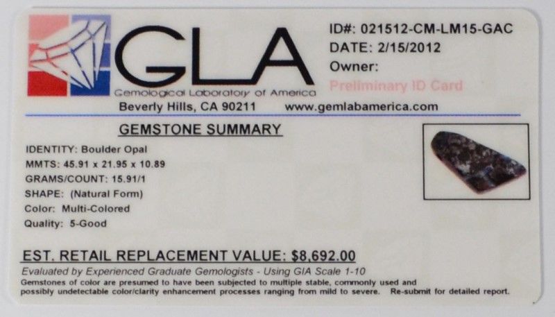 Boulder Opal is strung on a leather Necklace with a silver lobster claw closure. Opal is in it's natural form and is multi colored. Weighs 15.91 grams. Gemological Laboratory of America estimates value at $8692.00. (Includes Paperwork)