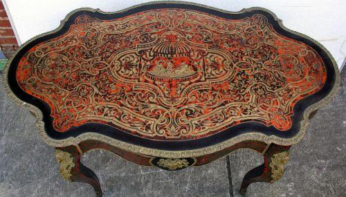 Table in Boulle style with inlaid turtle top with fitted glass on top. Louis XIV French style. Beautiful rich deep red color. Nicely constructed, in nice condition, but some of the applied work is loose.