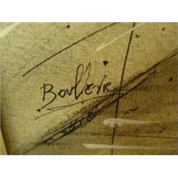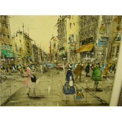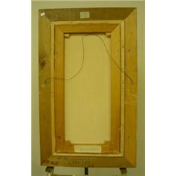 Oil on canvas. Boullevie. "Paris Street Scene". Contemporary and admirer of Raoul Dufy. Studied at Ecele des Beaux Arts in Paris. Canvas - 25" x 13". Overall 30-1/2" x 18-1/2". 1960's period frame. Signed. Condition: Excellent