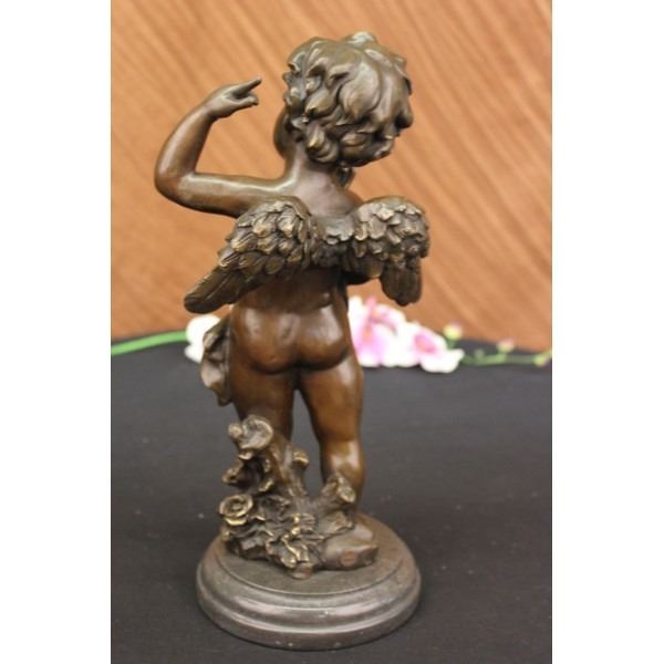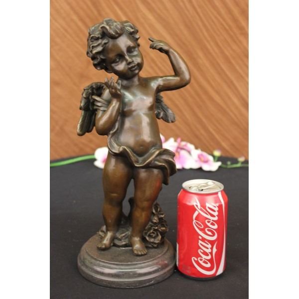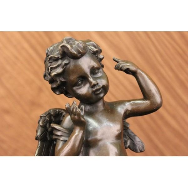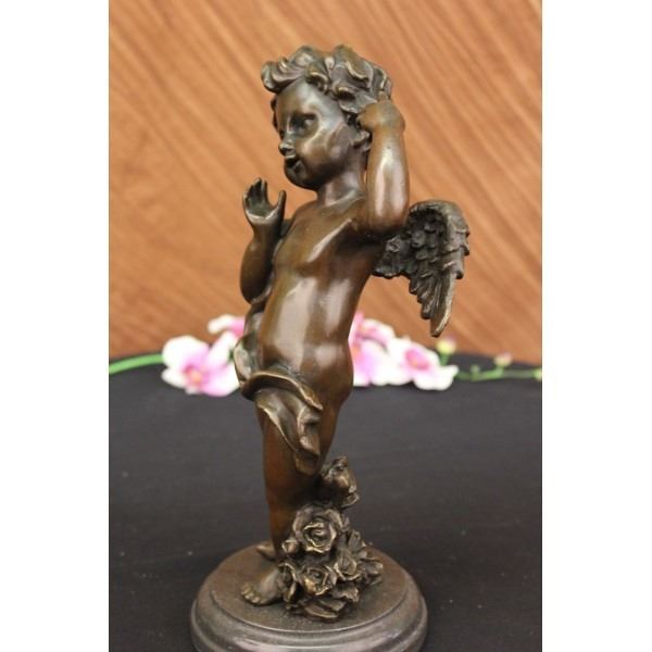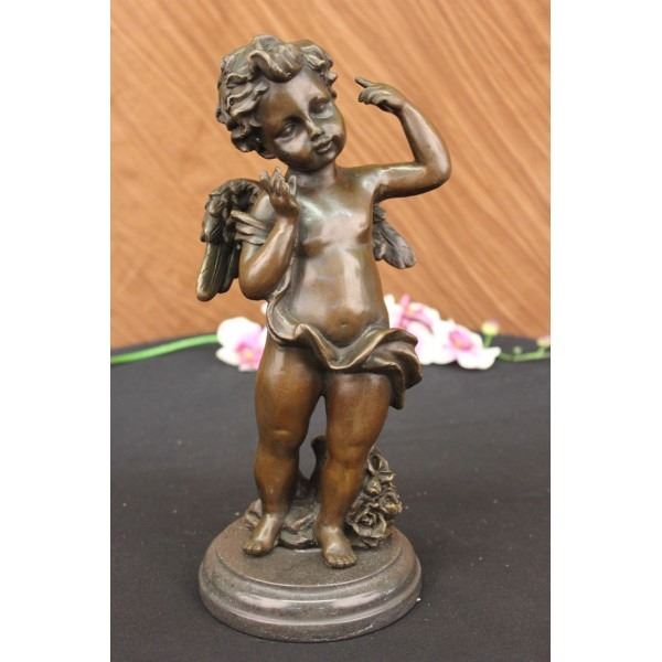 The bouncy cherub points and waves his hands quizzically near his face. His hair is beautiful curls on top of his round childish face. A cloth sashes from the top of his arm down the side of his body across and to the back. This bronze sculpture was crafted using the lost wax method and full of innocence and charm and stands on a marble base. Dimensions: Height 14 X Width 6 inches. Weight: 10 LBS.
