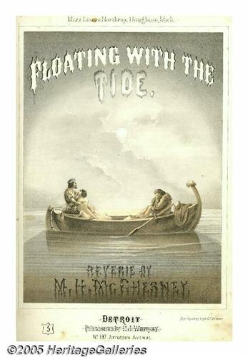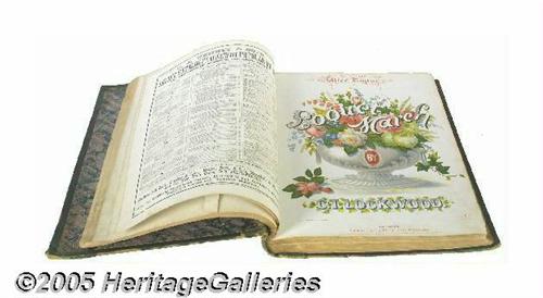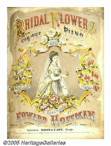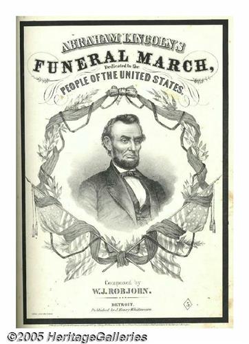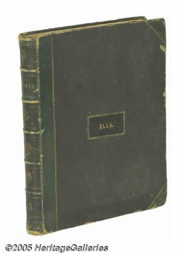 <B>Bound Collection of Sheet Music, Including "Abraham Lincoln's Funeral March"</B></I> One woman's custom bound, personal collection of sheet music, ribbed spine in leather titled "Music," labeled on cover as being for someone named "Ella." An owner's inscription on one issue has her as Ella Fralick. Most works are nondescript piano fortes with simple covers. A few have nicer designs. One with a lovely design caught our eyes - "Abraham Lincoln's Funeral March." Light age/foxing, nice. Lot:253