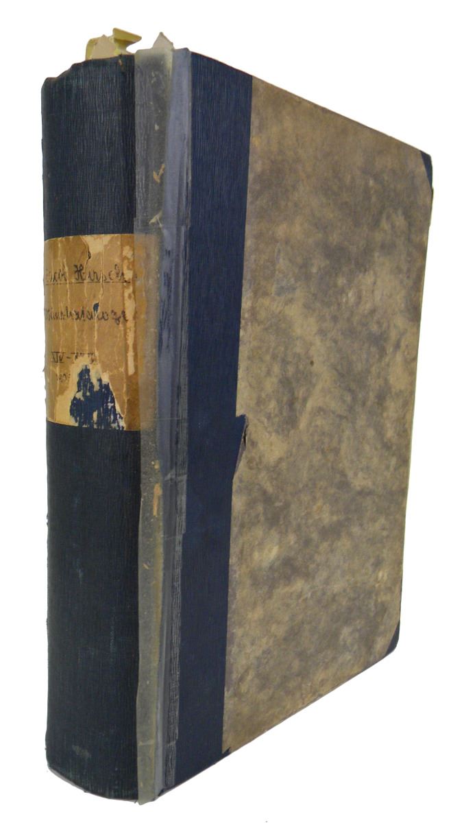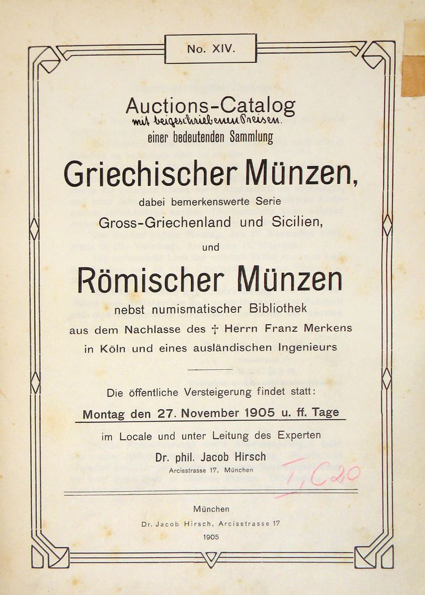 Hirsch, Jacob. AUCTION SALES NOS. XIV THROUGH XXII. München, 1905-08. Nine auction catalogues, textually complete but for the most part lacking plates: only Sale XXII has the plates present. Auction XXI is the Weber Greek sale. Occasional text illustrations. Old tabs mostly worn away. The Weber sale includes a contemporary newspaper clipping about the sale and a couple pages of handwritten notes. Bound in one volume. 4to, contemporary blue cloth-backed boards; hand-lettered spine label. Binding worn and taped. Very good or so. A bound volume containing nine of these scarce and important sales, though sadly lacking the plates (except for the final catalogue). Spring 372-379. The Weber Greek sale is remarkably important and very scarce. Clain-Stefanelli 2000*. Grierson 288: “D’une richesse et d’une importance exceptionnelles.” Spring 378. Ex RBW Library.