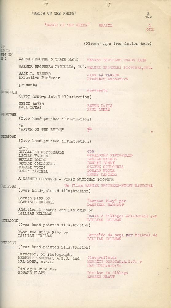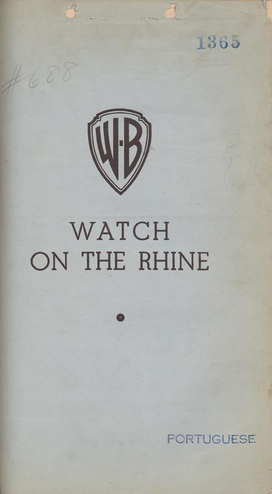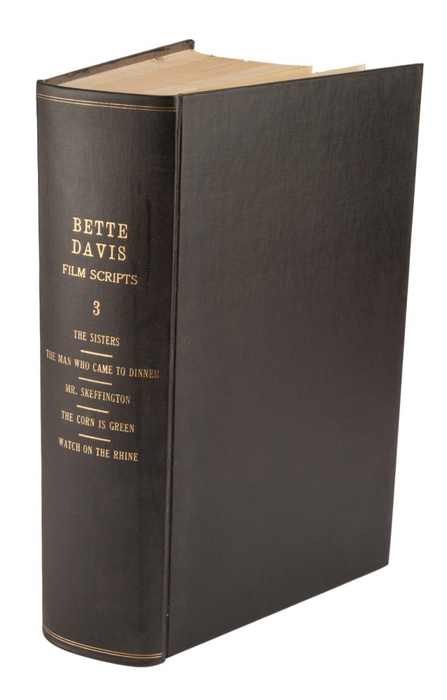 Bound volume of five dialogue subtitling scripts for Bette Davis films of the 1930’s and 40’s, including Dashiell Hammett and Lillian Hellman’s Watch on the Rhine. (Warner Bros., 1938-45) Legal-size original studio dialogue-continuity scripts (5) professionally bound in cloth (including original studio printed wraps), with extensive typed and hand-written notes for foreign-language subtitling. Titles include: The Sisters (1938, 123 pp); The Man Who Came to Dinner (1942, 140 pp); Mr. Skeffington (1944, 140 pp); The Corn is Green (1945, 131 pp); and Watch on the Rhine (1943, 138 pp). Condition Very Fine throughout, with exception of minor tattering to one wrap.