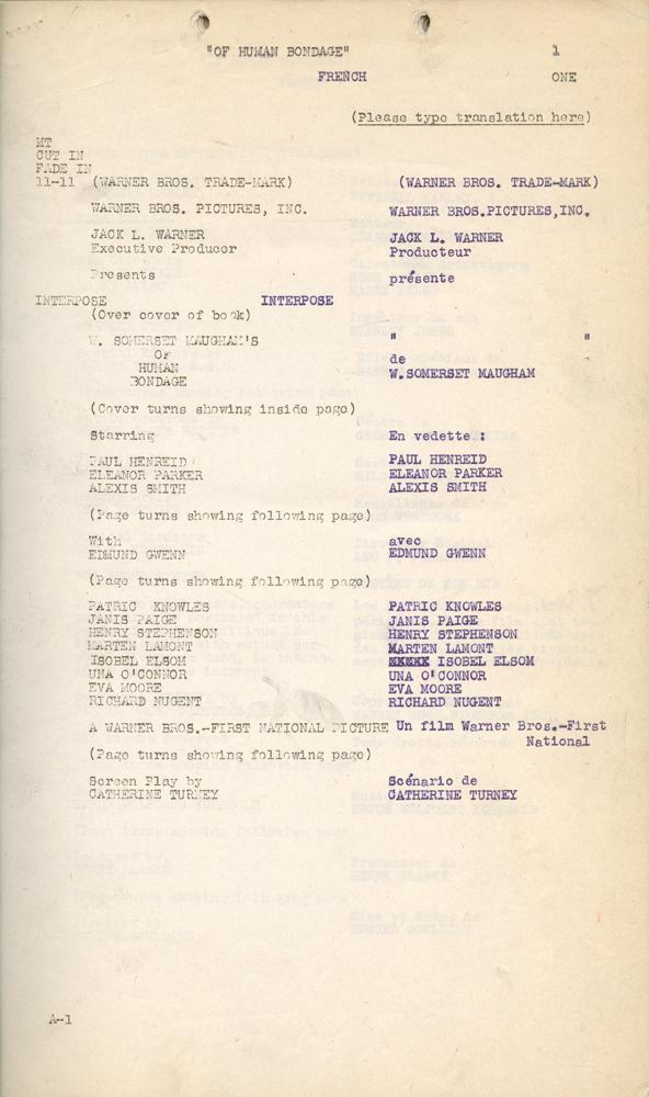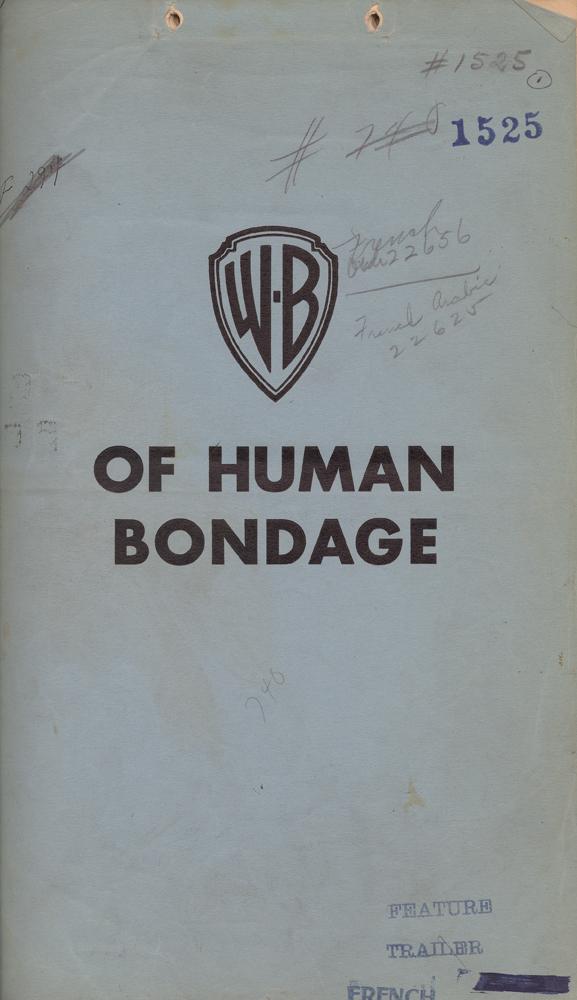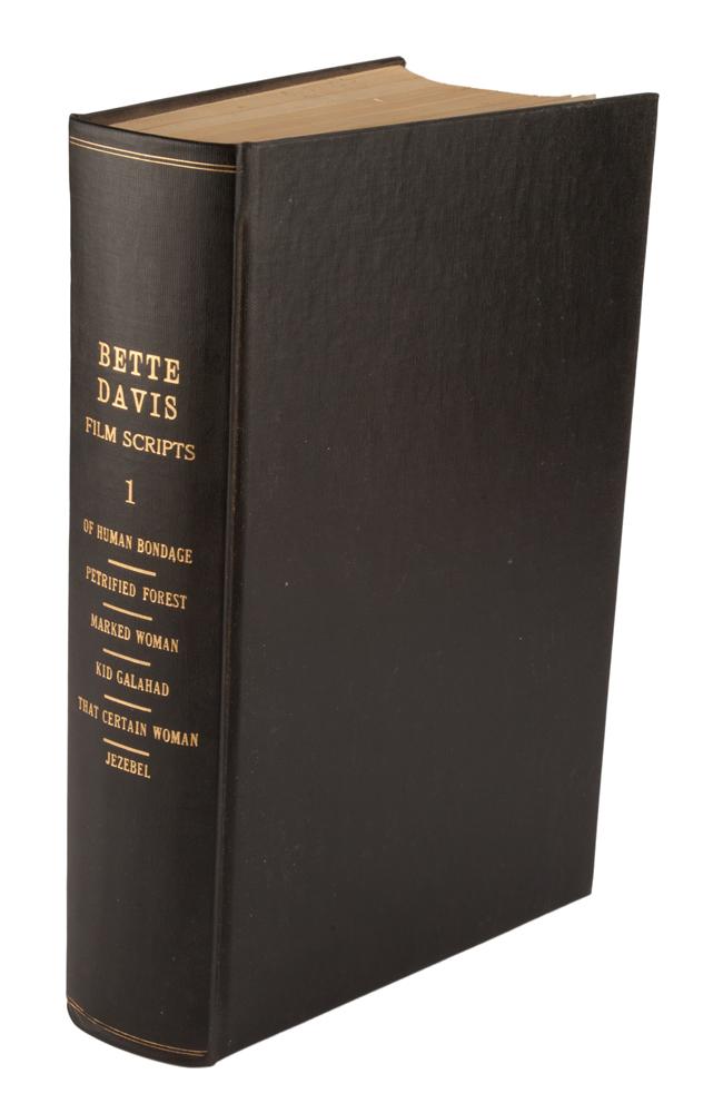 (Warner Bros., 1934-38) Legal-size original studio dialogue-continuity scripts (6) professionally bound in cloth (including original studio printed wraps), with extensive typed and hand-written notes for foreign-language subtitling. Titles include: Of Human Bondage (1934, 107 pp); Petrified Forest (1936, 79 pp); Marked Woman (1937, 90 pp); Kid Galahad (1937, 91 pp); That Certain Woman (1937, 89 pp); and Jezebel (1938, 101 pp, plus trailer, 7 pp). Very Fine overall, with some handling to individual wraps and title pages.