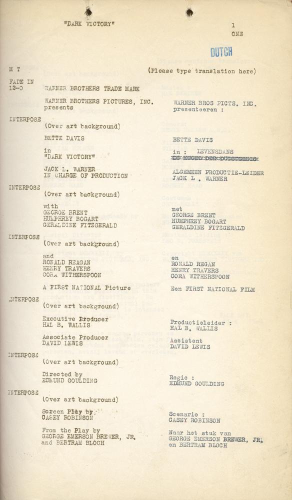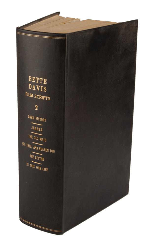Bound volume of six dialogue subtitling scripts for Bette Davis and Humphrey Bogart films of the 1930’s and 40’s, including Dark Victory and The Letter. (Warner Bros., 1938-42) Legal-size original studio dialogue-continuity scripts (6) professionally bound in cloth (including original studio printed wraps), with extensive typed and hand-written notes for foreign-language subtitling. Titles include: Dark Victory starring Bette Davis and Humphrey Bogart (1939, 123 pp); Juarez (1939, 140 pp); The Old Maid (1939, 114 pp); All This and Heaven Too (1940, 184 pp); The Letter (1940, 89 pp, no front wrap); and In This Our Life (1942, 107 pp). Condition Very Fine throughout.