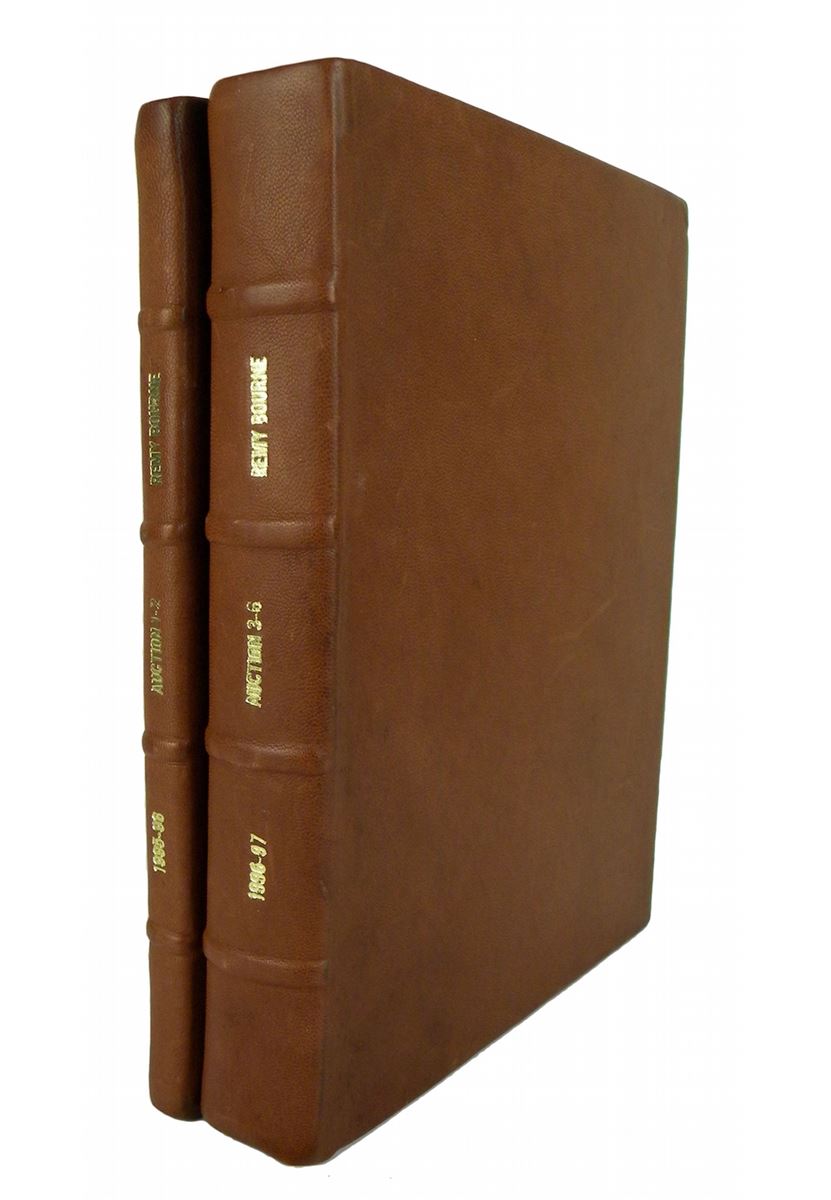 Bourne, Remy. PUBLIC AUCTION & MAIL BID SALES I-VI. Minneapolis etc., 1995-97. Six sales, as bound in two volumes. 4to, matching brown cowhide; spines with four raised bands, lettered in gilt; original printed card covers bound in. Prices realized lists bound in. A privately bound set of Bourne's first six catalogues, bound by a customer in Haiti and presented to Bourne (letter enclosed). Ex Raymond Hale library.