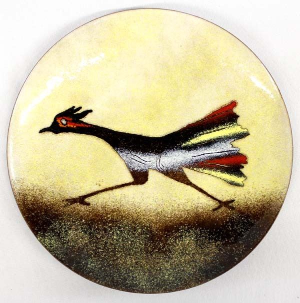 Bovano Enamelware Roadrunner Plate, measures 8''D, original label on the bottom