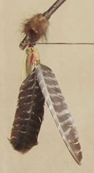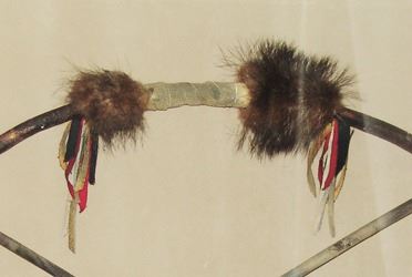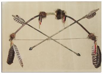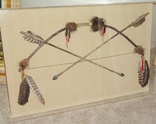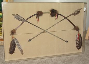 Contemporary display containing a wooden stick bow and two feather arrows, in a large, custom, plexiglass display frame (we can send items only, to save on shipping- upon request). Very good condition. Late 1900s. 27" x 41"