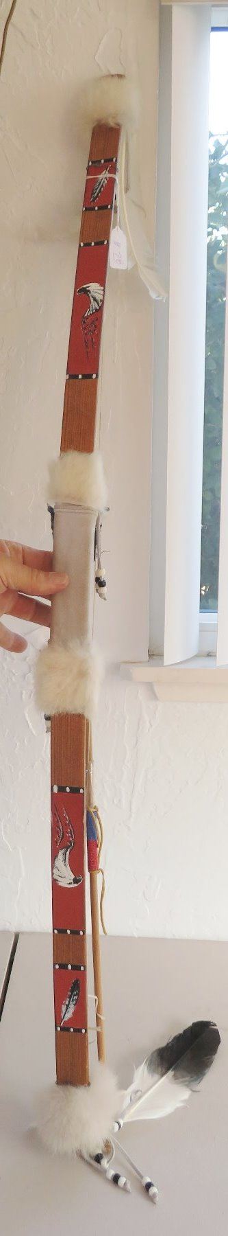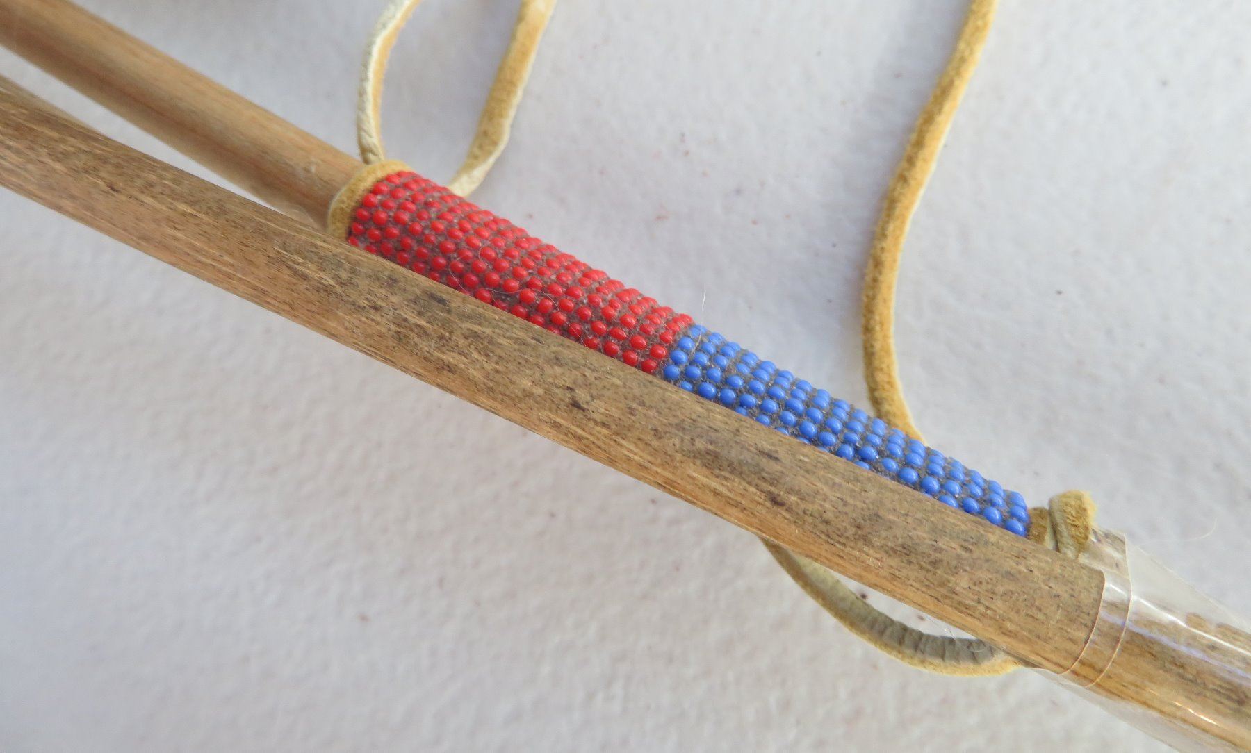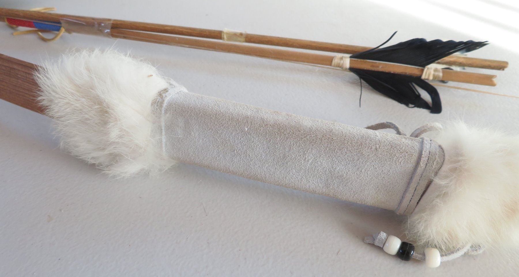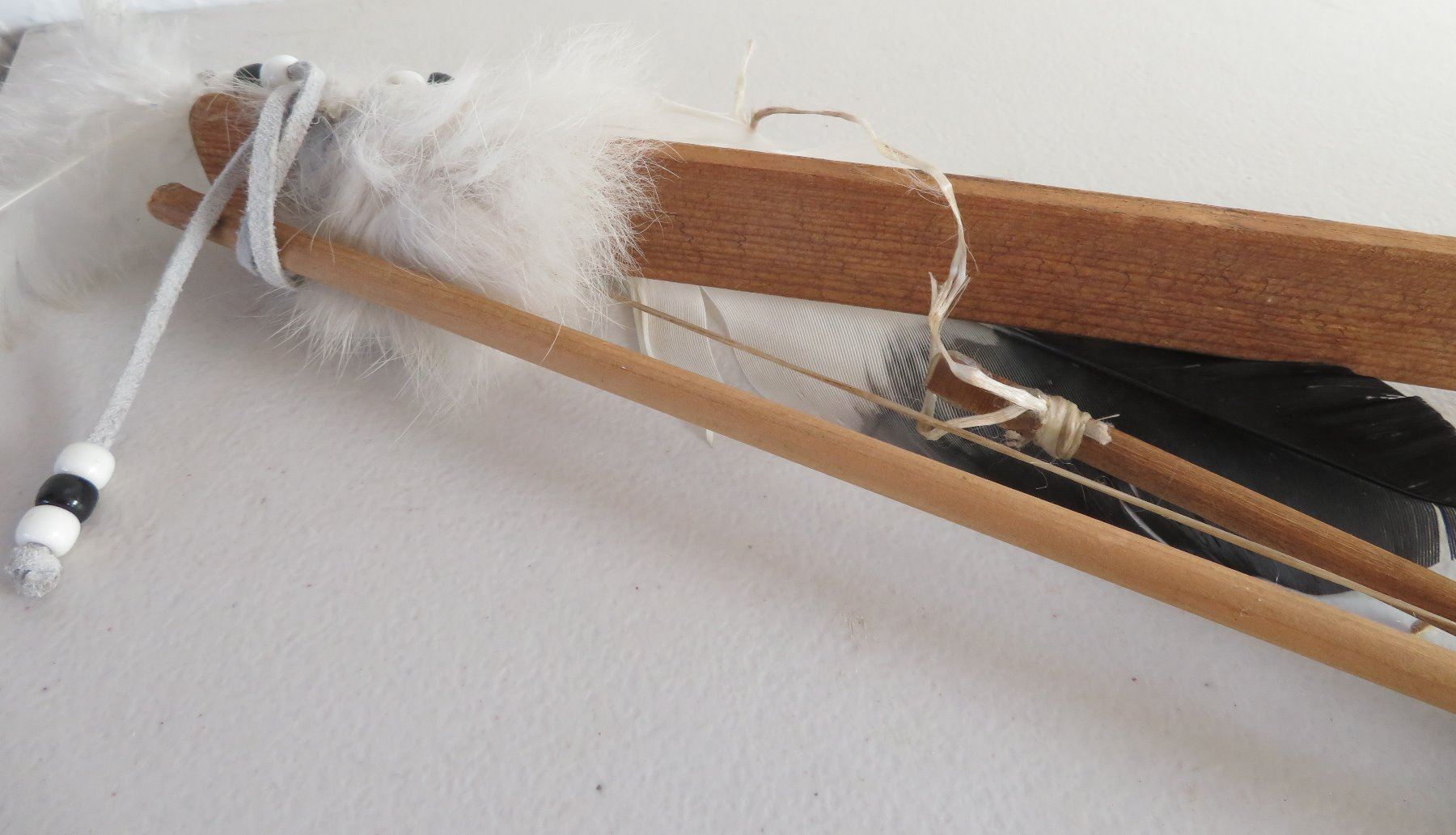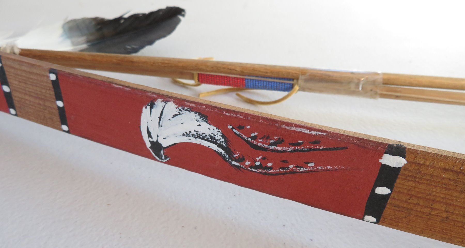 Bow & Arrow Set, c. 1950s. Made of wood, paint, feathers and beads, the bow measures 46" x 2" and the longest arrow is 28". Cheyenne. Condition: Arrow damage, see images. Shipping: $50.00 USA estimate only, due to length.