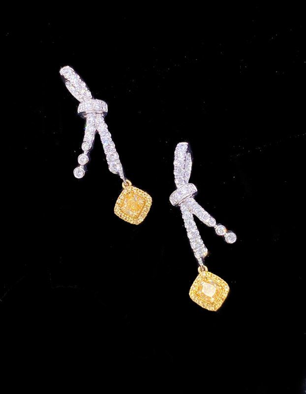 A pavé diamond bow motif with dangling cushion yellow-diamond drops framed by a yellow-diamond micro-halo, set in white metal—playful, graceful, and brilliantly sparkly. Main diamond: 0.634ct, side diamonds: 0.588ct. Note: Comes with an AGL certificate and a domestic jewelry identification certificate.
